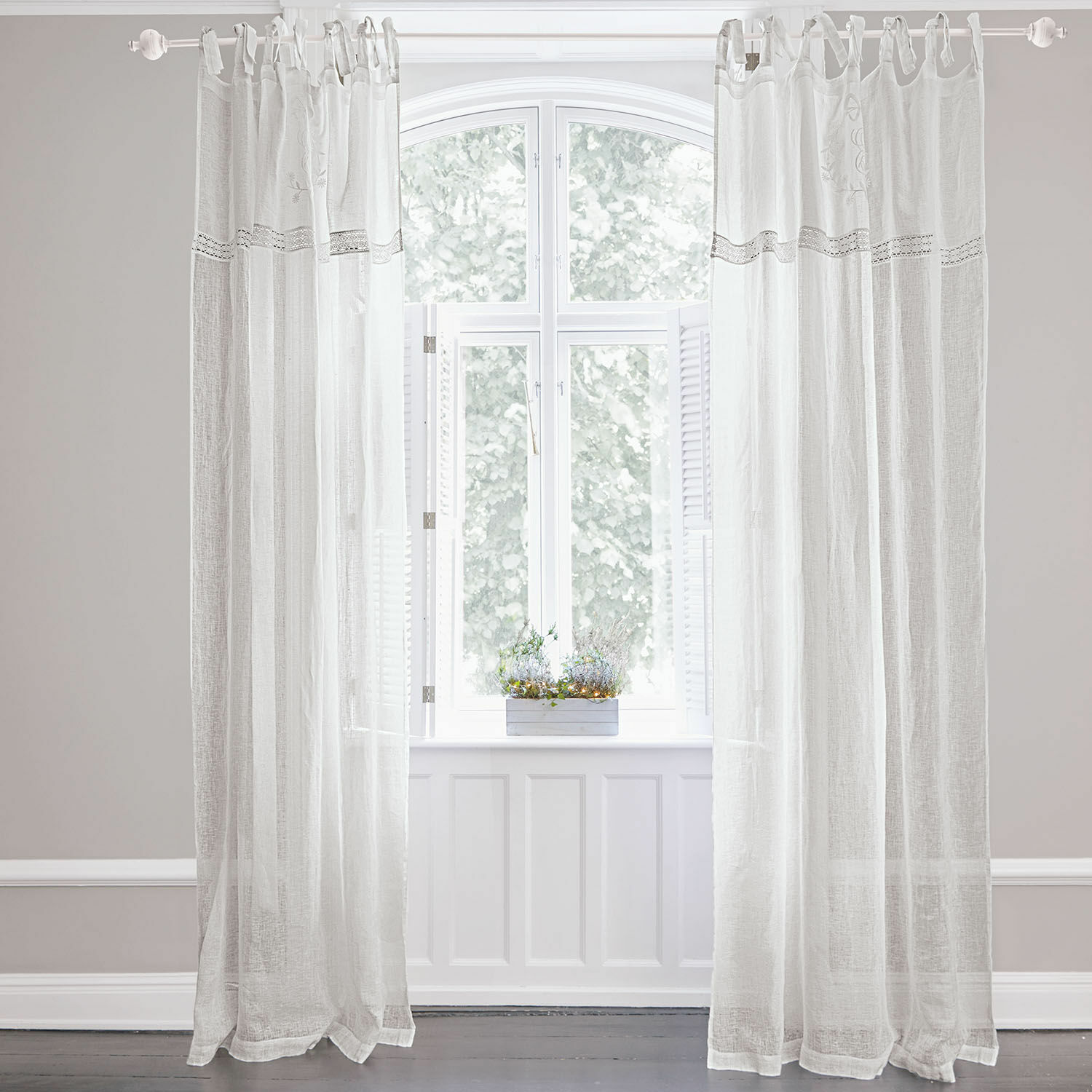 Manchmal bedarf es nur einen Blick und schon hat man sich verliebt in das Wohnaccessoire. So geht es Ihnen bestimmt auch mit dieser edlen Gardine, denn Sie hat alles, was man für eine gelungene Raumwirkung braucht: Ein natürliches Leinengewebe mit charaktervoller Struktur und geschmeidigem Fall, eine dezente Stickerei, die Nostalgie-Charme versprüht und eine gewünschte Blickdichte, die vor starker Sonneneinstrahlung und neugierigen Blicken schützt. Mit Bindebändern lässt sie sich dekorativ an jede Vorhangstange anbringen. Ein behaglicher Wohnakzent für den Vintage-Chic. Duftig, schlicht und stilvoll harmoniert sie mit jedem Farbkonzept und strahlt eine wunderbare Leichtigkeit aus. Bei offenem Fenster ist der Effekt nochmal so schön – wenn jeder zarte Windhauch sanft mit der Gardine spielt.