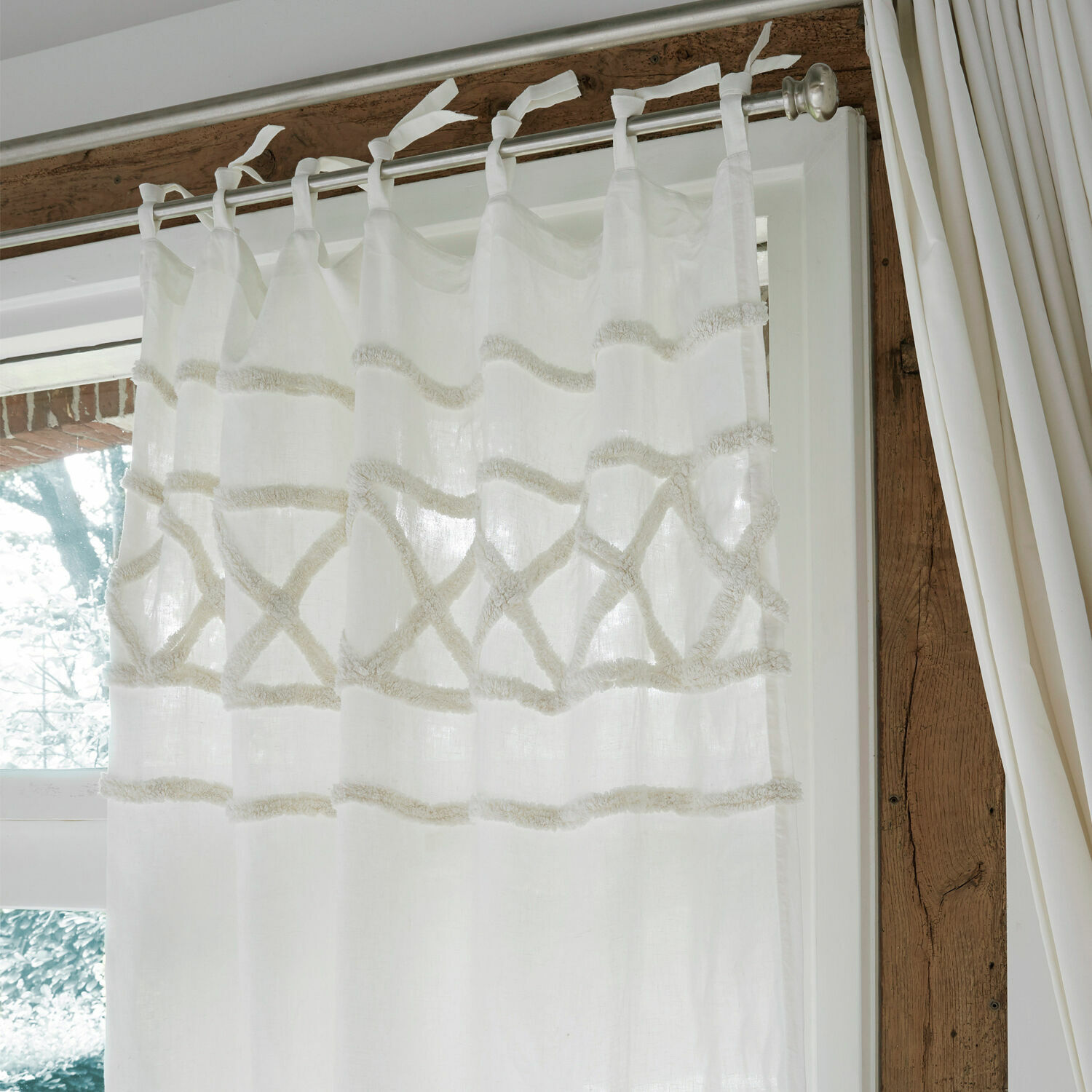 Machen Sie Ihre Wohnträume wahr und gestalten Sie Ihr Zuhause mit ausgesuchten Möbelstücken und Accessoires in hellen Farben und natürlichen Materialien. Ein Wohngefühl entsteht, das sanft, ausgeglichen und harmonisch ist. Auch diese Gardine aus hochwertigem Leinen-Baumwoll-Mix erfüllt diesen Anspruch und ist bestimmt zu Ihrem Ambiente passend. Das Naturgewebe fließt wunderbar weich, filtert eine zu starke Sonneneinstrahlung und lässt den Raum mit sanftem Licht durchfluten. Dezent und doch ausgesprochen dekorativ ist das getuftete Rautenmuster im oberen Bereich – ein origineller Akzent, der die Gardine zu etwas Besonderem macht und ihr eine elegante Anmutung verleiht. Mit verspielten Bindebändern lässt sich das Textil ganz unkompliziert an jede Vorhangstange anbringen. Ein stilvoller Blickfang am Fenster, der immer zeitlos und edel wirkt – und mit vielen Einrichtungskonzepten kombinierbar ist.