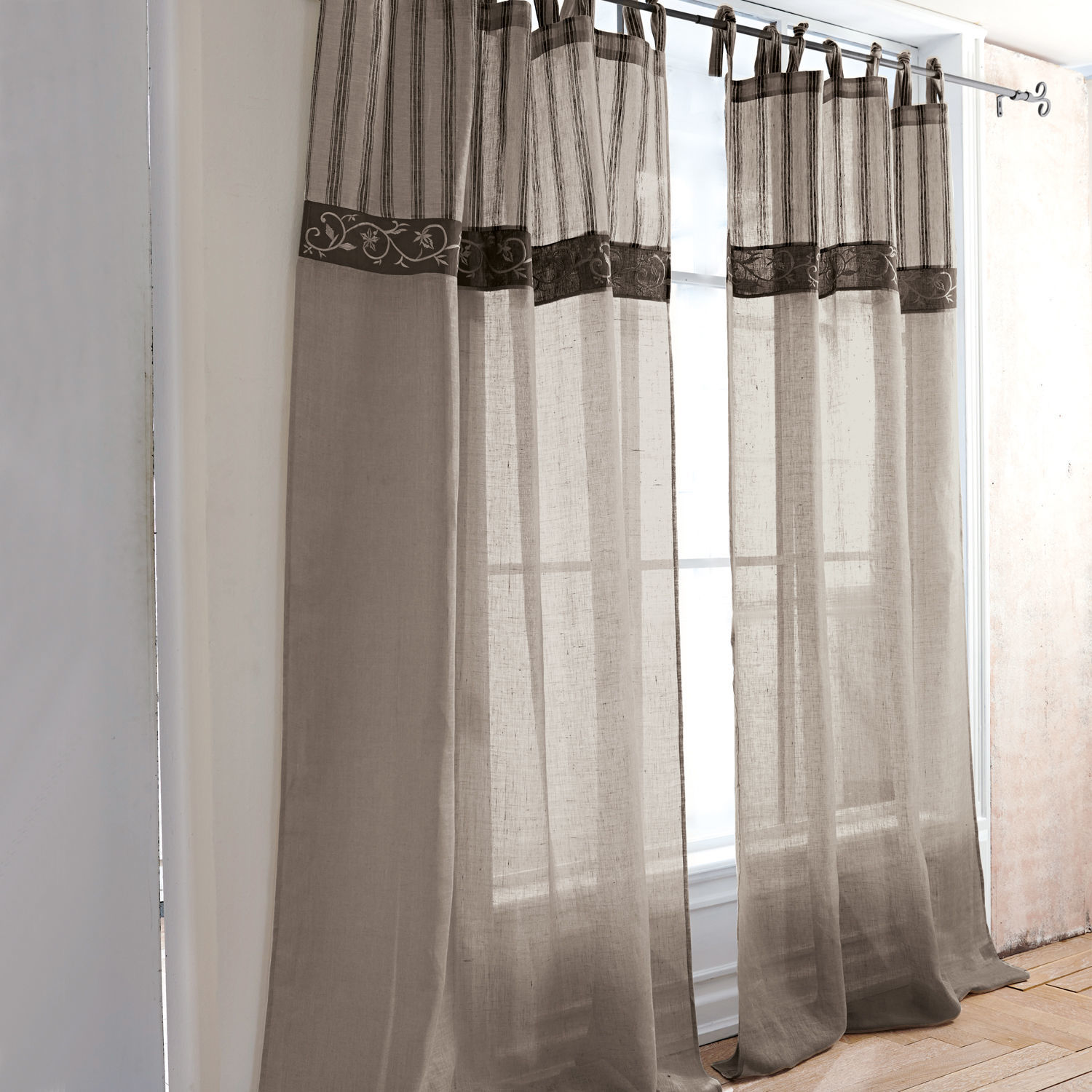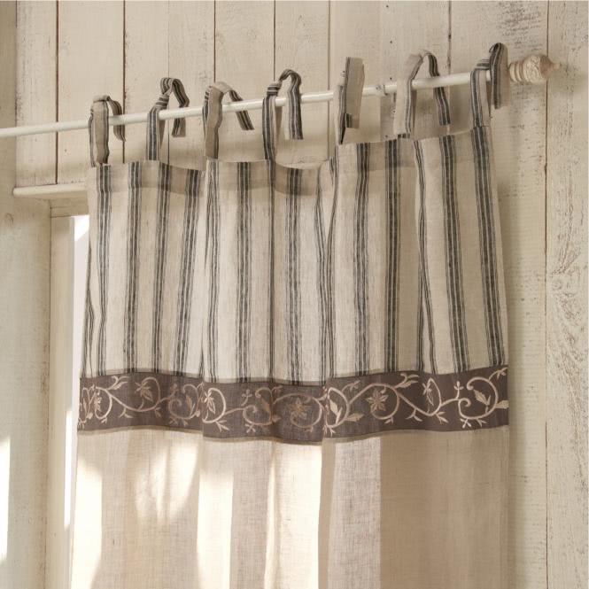 Leinen-Gardine mit aufwändiger Bordüre. Wunderschöner Landhaus-Stil: Oben zeigt sich die Gardine in frischem Kontrast gestreift, unten unifarben. Den Übergang […]