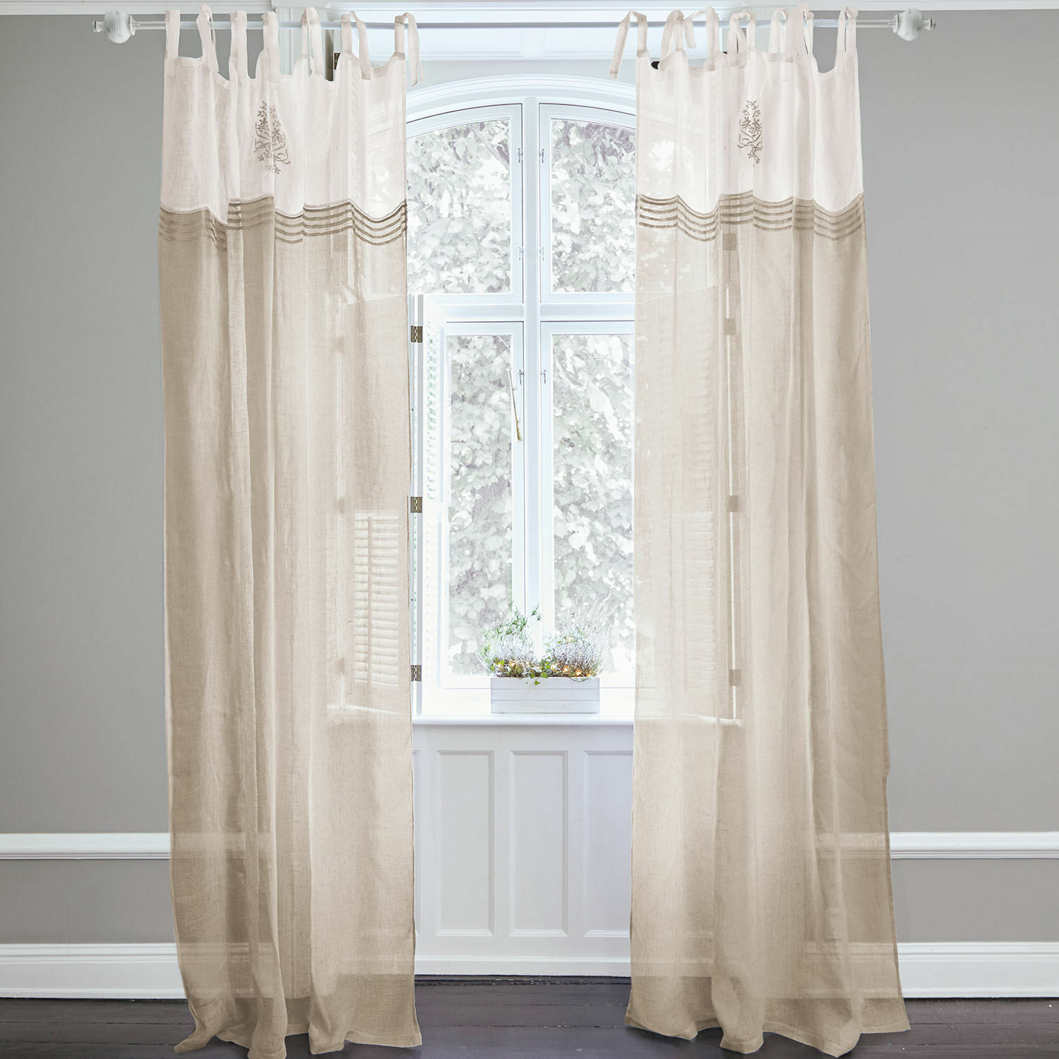 Stilvolle Biesen und feine Stickerei – diese Gardine scheint wie gerade aus Großmutters historischem Wäscheschrank genommen: Wenn Sie ein Faible für nostalgischen Zauber haben, kommen Sie an diesem Schmuckstück nicht vorbei. Der Stoff, aus dem die Träume sind, ist hier reines Leinen – luftig leicht und zugleich robust und reißfest. Die Gardine passt zum Beispiel perfekt in ein helles Wohnzimmer im Romantik-Look oder in ein Schlafzimmer mit Vintage-Möbeln. Aber auch im Kontext von modernen, geradlinigen Einrichtungsstilen kann es eine kontrastreich nuancierte Wirkung entfalten. Freuen Sie sich auf viele schöne Momente, etwa wenn Sie sich an Winterabenden vor der Kälte draußen abschirmen – oder wenn der Frühling wiederkehrt, Sie die Fenster wieder öffnen und der Wind mit dem feinen Leinen zu spielen beginnt.