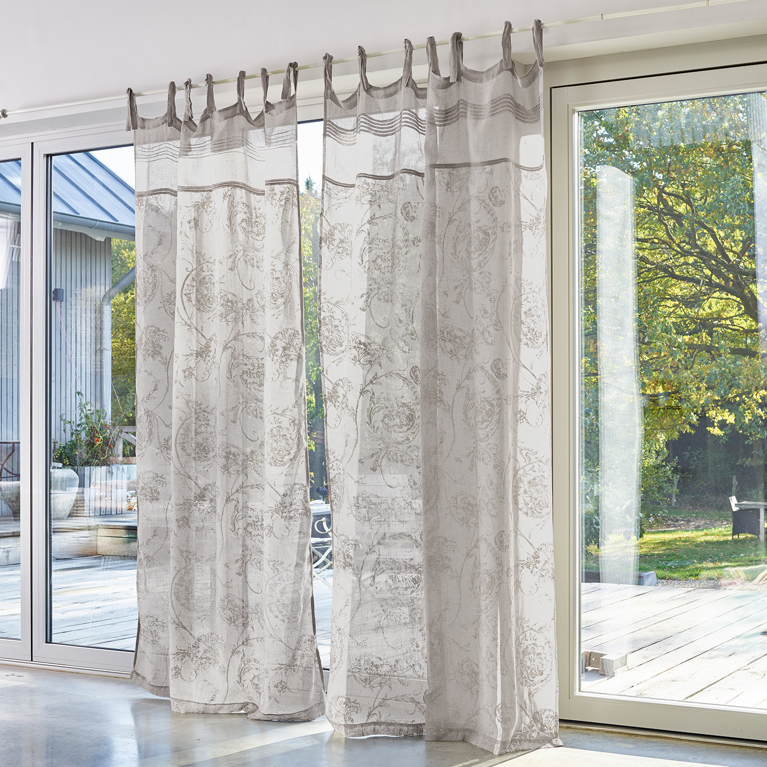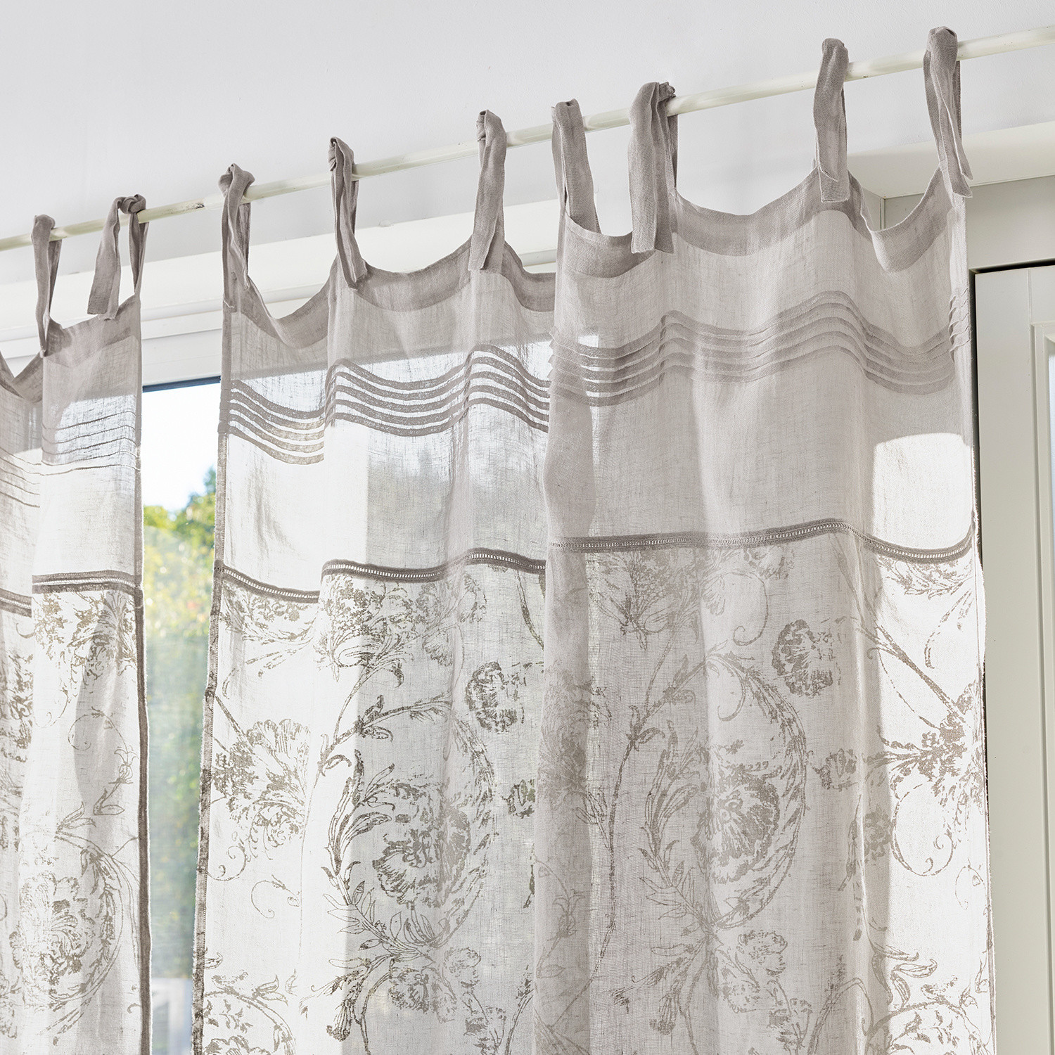 Aus reinem Leinen mit dezent beflocktem Muster. Mit zierlichen Bindebändern zum Befestigen an Gardinenstangen. Vintage-Charakter und leicht transparenter […]