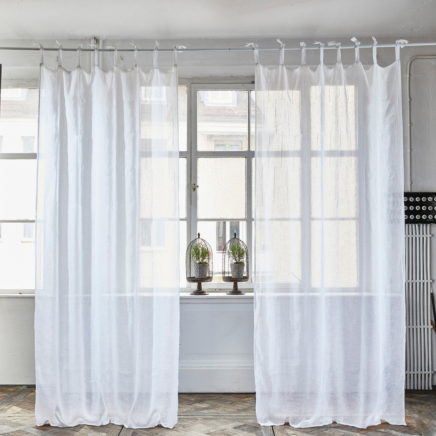 Einen stilvollen Akzent voller Leichtigkeit und Frische setzt dieses charmante Accessoire aus hochwertigem Leinen am Fenster. Der Stoff ist so zart gewebt, dass das Licht des Tages durch das Material scheint. So kann der Vorhang auch tagsüber als leichter Sichtschutz verwendet werden und zugezogen bleiben. Hübsche Biesen schmücken den oberen Teil des feinen Gewebes. Befestigt wird der feine Vorhang mit sehr schönen Bindebändern an der Gardinenstange. Diese können entweder locker geknotet oder zu hübschen Schleifen gebunden werden. Je nachdem in welcher Länge die Bänder an die Stange gebunden werden, fällt die Länge des Stoffs unterschiedlich aus. Ein paar Zentimeter länger oder kürzer? Sie können die Bindebänder der Höhe des Raums anpassen oder ganz nach Geschmack den Stoff leicht auf dem Boden aufliegen oder im Raum schweben lassen. Das zeitlos schöne Design passt gleichermaßen zu klassisch eingerichteten Räumen, zum Landhaus-Stil oder auch zu romantischem Interior wie dem Shabby Chic.