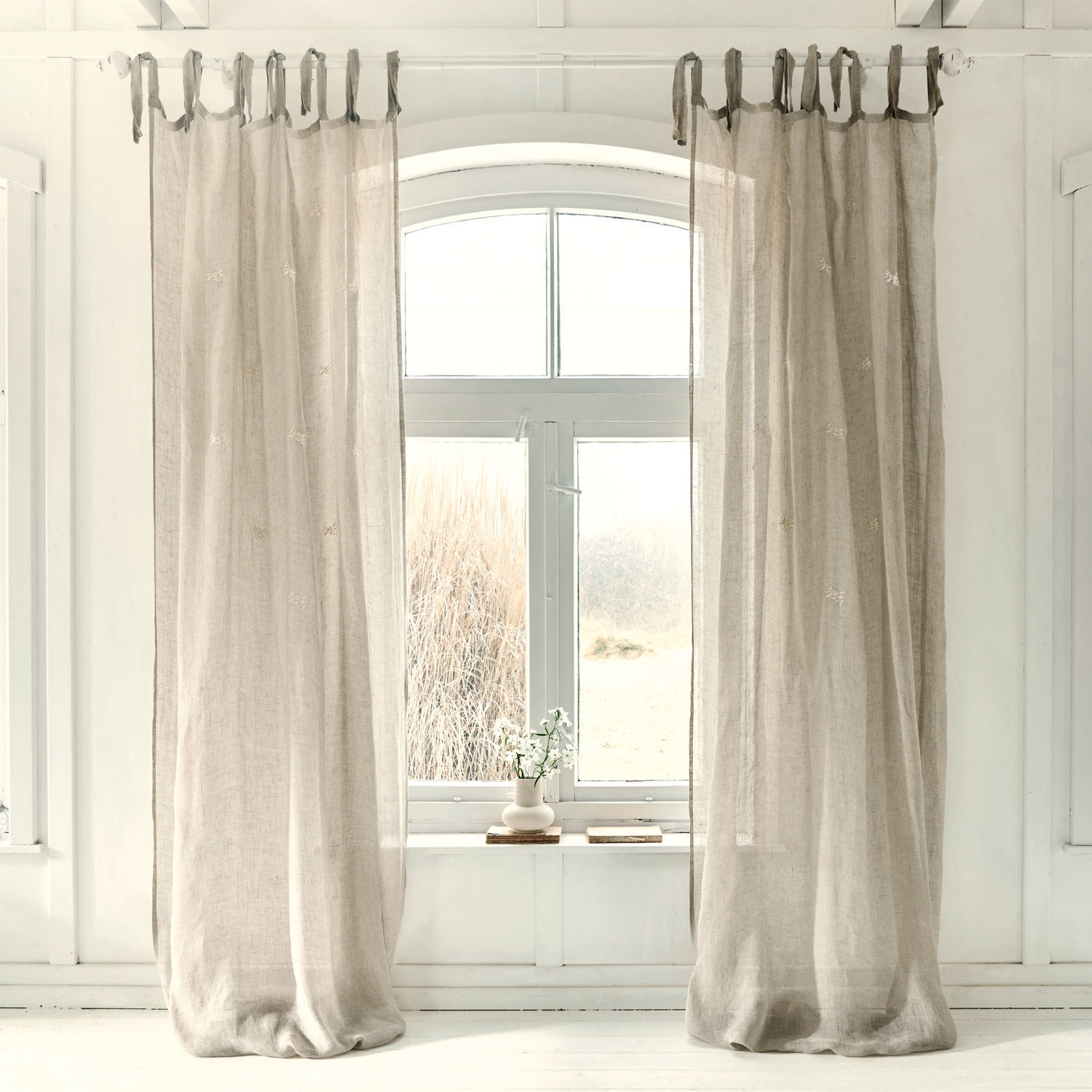 Die naturfarbene Gardine im romantischen Landhaus-Stil punktet mit ihrer hochwertigen Verarbeitung und reiner, pflegeleichter Leinenqualität. Bestickt mit zarten Blumensträußen passt der lichtdurchlässige Vorhang besonders gut zu einer klassisch-eleganten Einrichtung oder in ein Ambiente mit Landhaus-Charme – ob im Wohn- oder Schlafzimmer. Praktisch: Die am oberen Ende befindlichen Bindebänder unterstreichen noch den charmanten Romantik-Look und dienen überdies zum schnellen und einfachen Befestigen an jeder Art von Gardinenstange.