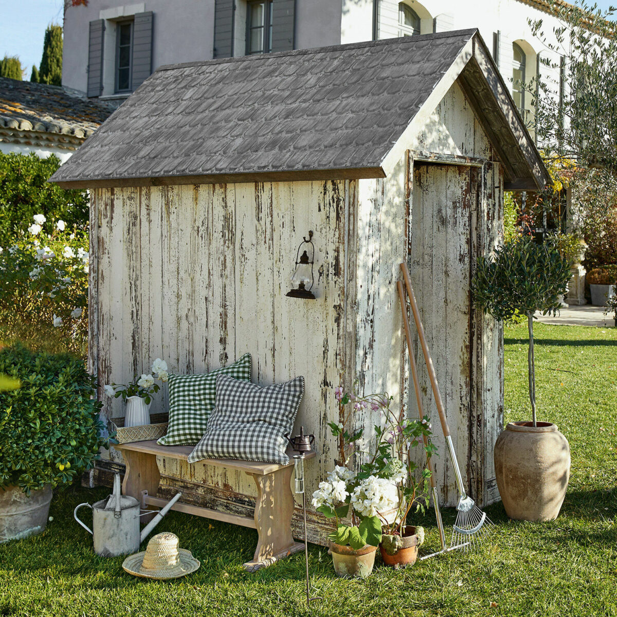 Berühmte, ausgedehnte Parkanlagen wie auch kleine romantische Bauerngärten gibt es in England (fast) wie Sand am Meer. Und schlendert man durch die grünende und blühende Pracht, bewundert hier einen exotischen Strauch und genießt dort den Duft einer prachtvollen Rose, fällt manchmal der Blick auch auf ein Gartenhaus, in dem der Gärtner schon früher seine Gerätschaften aufbewahrte und das auch heute noch die gleiche Funktion erfüllt. Das aber inzwischen aussieht, als hätte es schon dort gestanden, als die heute historischen Rosensorten noch unbekannte Neuzüchtungen waren. Mit diesem Gartenhaus zieht das ganz besondere Flair englischer Gartenkunst auch in modernen Gärten ein und macht Lust, selbst mit Hand anzulegen. Hacken, Scheren und Sägen, Rasenmäher und Vertikutierer, Dünger, Sämereien und vieles mehr wird dort im Inneren bequem Platz finden. Gut geschützt vor Wind und Wetter und mit einem Griff zur Hand. Das Gartenhaus hat ein wasserdichtes Dach aus Zink und wurde im klassischen Stil aus wiederaufbereitetem Kiefernholz gefertigt, das zusammen mit dem wunderschön authentisch wirkenden Antik-Finish den besonderen Reiz des Hauses ausmacht. Tipp: Ein Wandregal und Haken im Inneren helfen Ihnen, noch besser Ordnung zu halten. Und mit einem zusätzlichen Schloss lässt sich das Haus auch abschließen, um alle Gerätschaften sicher und verschlossen aufbewahrt zu wissen.