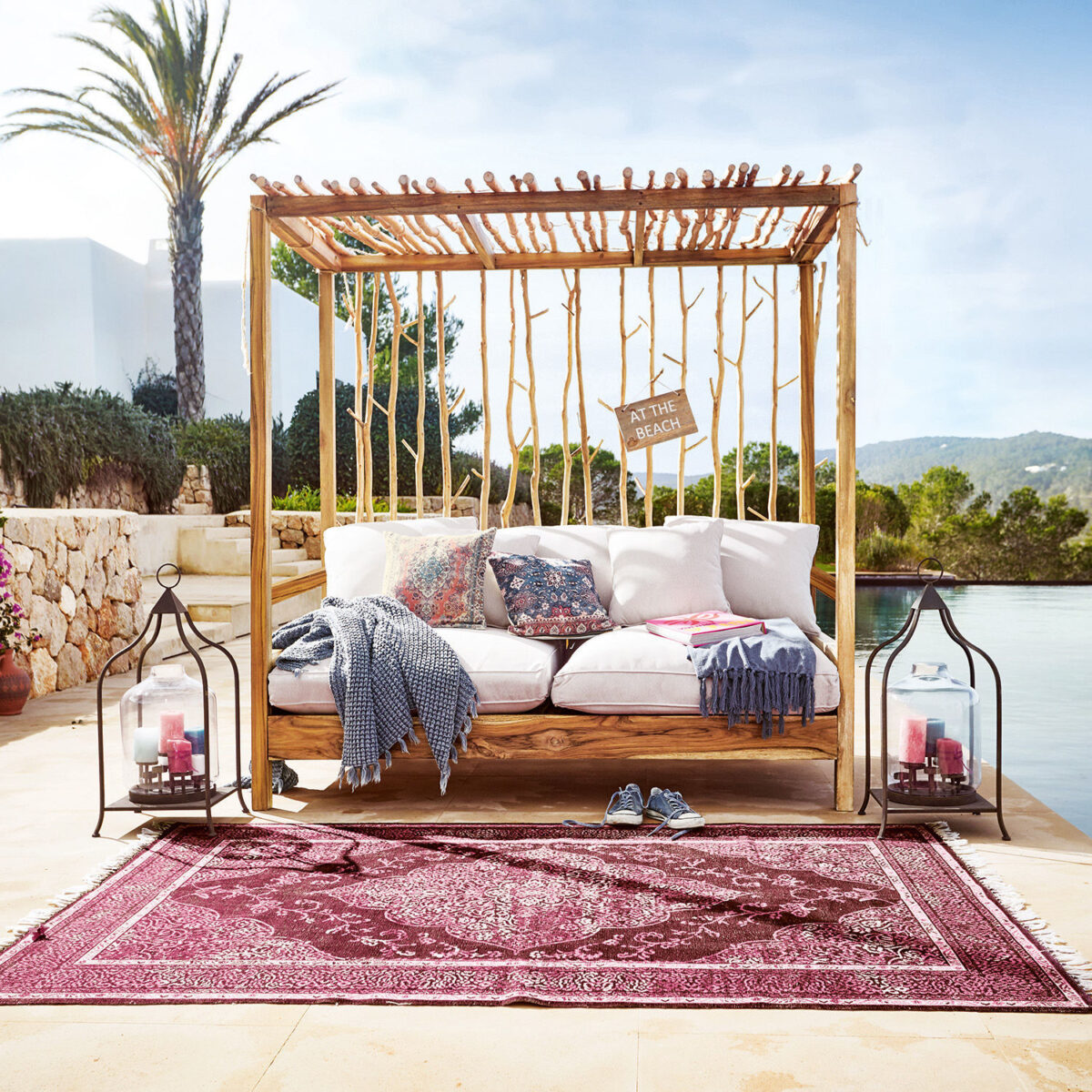 Wo Ihre Trauminsel auch liegen mag – in der Karibik, auf den Malediven oder in Polynesien – eines ist sicher: Sie können nicht immer dort sein. Aber wir haben eine wunderschöne Idee, um Ihr Fernweh ein wenig zu lindern: Eine Ersatz-Trauminsel in Form dieser Gartenlounge. Lassen Sie sich nach einem anstrengenden Arbeitstag in die weichen Kissen sinken, verbringen Sie am Wochenende ganze Tage darin und lassen sich zum Träumen verführen: von endlosen Stränden, türkisblauem Wasser und Palmen, deren imposante Wedel angenehmen Schatten spenden, während Sie auf keinen Komfort verzichten müssen. Wie in dieser Gartenlounge, die eine exotische Ausstrahlung mit dem Sitz- und Liegekomfort einer 6-Sterne-Lodge zu verbinden weiß. So tiefenentspannt und zugleich energiegeladen sind Sie bisher nur selten am nächsten Morgen im Büro erschienen. Das Außergewöhnliche an dieser Gartenlounge ist die Kombination aus einem klassischem Daybed mit einem stabilen Gestell aus massivem Teakholz und einem Himmel und Seitenteilen aus knorrig gewachsenen Teakholzästen. Diese sorgen auf der einen Seite dafür, dass an heißen Sommertagen ein leises Lüftchen für Abkühlung sorgen kann, auf der anderen Seite halten sie auch die neugierigen Blicke Ihrer Nachbarn fern. Und die exotische Optik ist natürlich jeden Tag aufs Neue faszinierend. Für den besonderen Sitz- und Liegekomfort zeichnen sich die insgesamt sechs Kissen verantwortlich, die dank des Polyesterbezugs angenehm strapazierfähig sind.