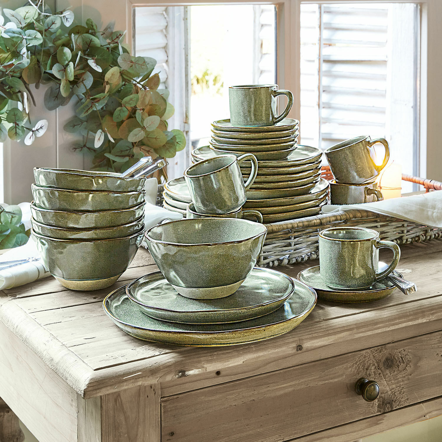 Ein reizendes, großes Set aus dreißig Teilen mit ganz ursprünglichem Charme. Das schicke Geschirr ist bewusst uneben designt, was ihm eine handgemachte Anmutung gibt. Es besteht aus Steingut mit handgetöpferter Optik. Der Boden ist bei allen Elementen unglasiert. Besonders bei den Schüsseln ist das sehr gut zu sehen. Diese unbearbeitete Seite macht das ganze Set noch reizvoller. Diese natürliche, mediterrane Note sorgt für Urlaubsgefühle. Hiermit ist Ihre Tafel immer perfekt passend und harmonisch eingedeckt. Das große Set ist ideal für Mahlzeiten mit Freunden und Familie in geselliger Runde. Enthalten sind sechs Abendessenteller, sechs Beilagenteller, sechs Tassen, sechs Unterteller und sechs Schüsseln. Vom Kaffee am Morgen bis zu Brunch und Frühstück, einem leichten Salat am Mittag, Obst und Käse als Snack, Kaffee und Kuchen am Nachmittag bis hin zum Dinner am Abend sind Sie hiermit bestens ausgestattet. Kleinere Sets dieses hochwertigen Geschirrs, wie zum Beispiel ein Set aus sechs Tellern oder ein Set aus sechs Tassen samt Untertassen, können Sie ebenfalls separat hier im Shop bestellen. Suchen Sie einfach nach unserer Biarré-Geschirrreihe. Wir wünschen guten Appetit.