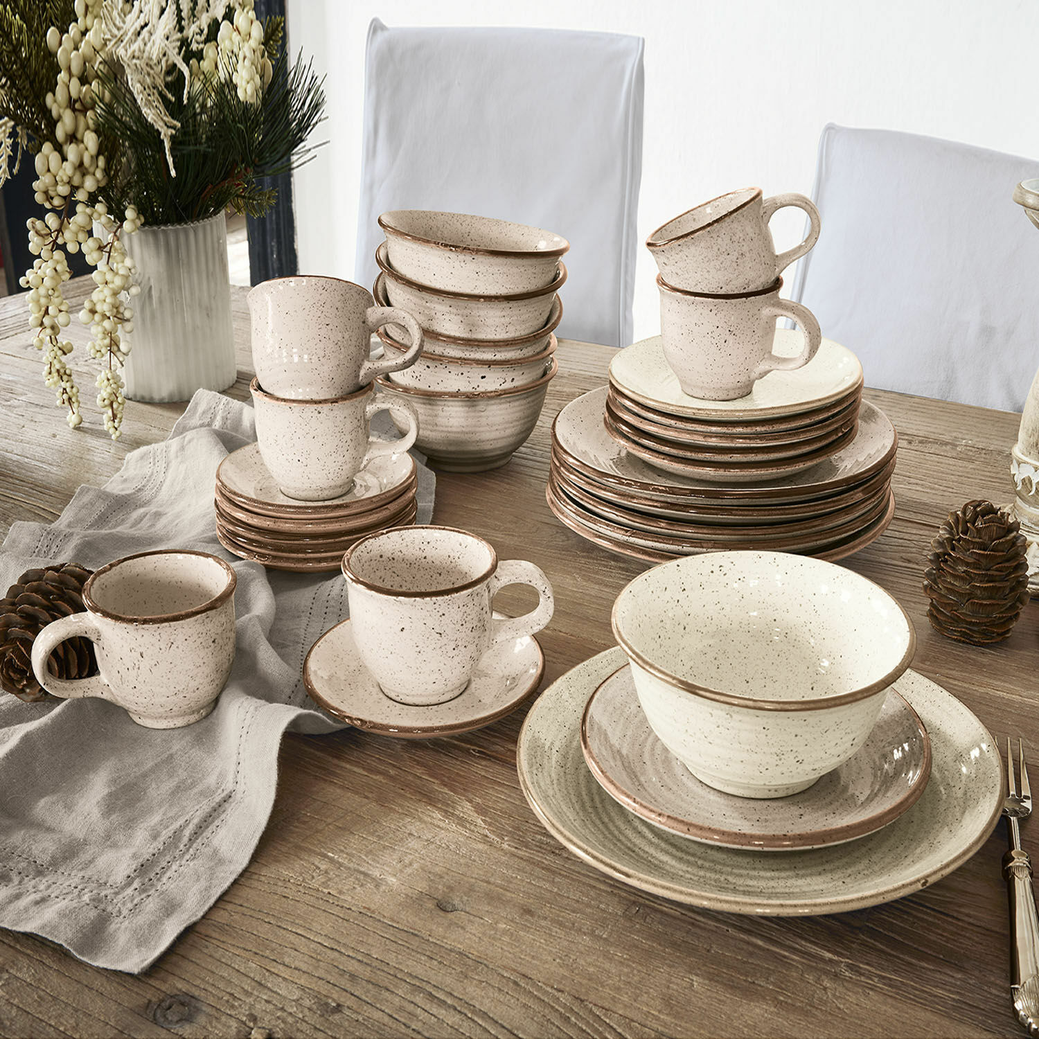 Wer schon einmal in der Toskana oder der Provence in einem kleinen Landgasthof eingekehrt ist, wird sich erinnern, wie dort die köstlichsten Speisen in rustikalem Steingut-Geschirr serviert wurden. Und wie gut dieses robuste Geschirr zu den rohen Holztischen und den edlen Leinenservietten passte. Und wie in der italienischen Trattoria die Pasta ganz selbstverständlich hausgemacht ist und in der französischen Auberge die Tarte zum Dessert frisch aus dem Ofen kommt, so ist auch das Steingut-Geschirr oft kunstfertig von Hand getöpfert, wie man an den kleinen Abweichungen von der Industrie-Norm erkennen kann. Die aber niemanden stören, sondern ihm erst den eigenen Charme verleihen. Auch dieses Geschirr 30er Set zeigt mit seinem bewussten unebenen Design den typischen Hand-made-Charakter und kommt besonders schön in einem stilvollen Landhaus-Ambiente zur Geltung. Das Geschirr 30er Set besteht aus hochwertigem Steingut und ist mit einer mikrowellengeeigneten Glasur in Tüpfel-Optik veredelt, sowie an den Ränders farblich abgesetzt. Schöne Rillen, die eine Töpferscheibe hinterlässt, erinneren an kunstvoll handgetöpferte Geschirr-Serien. Mit den je sechs kleineren und größeren Tellern, den Schalen, Tassen und Untertassen können Sie das Geschirr 30er Set zu den verschiedensten Gelegenheiten benutzen – vom Frühstück über Brunch und Kaffee bis zum Abendbrot.