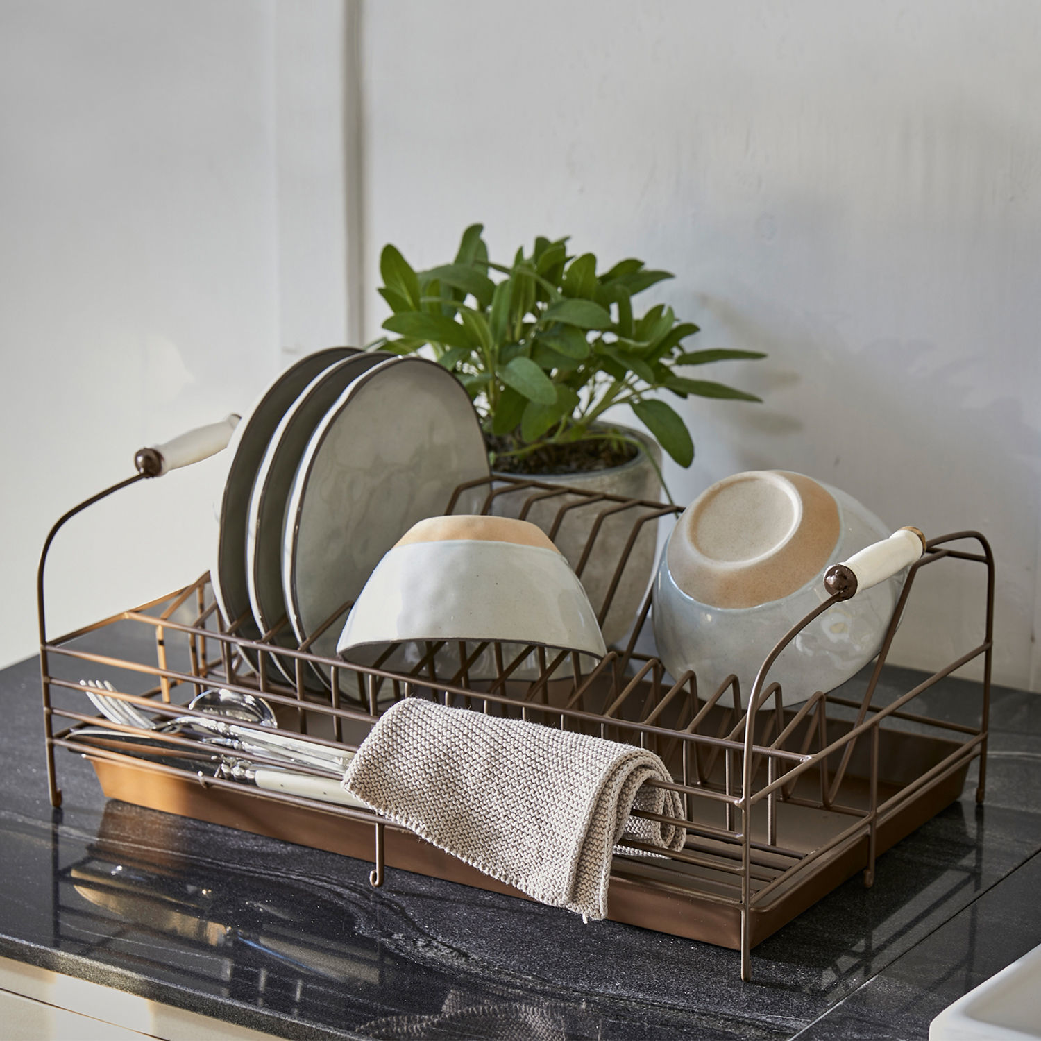 Nostalgisch, dekorativ und nützlich – dieser ansprechende Geschirrständer ist ein Multitalent. Er erinnert an Großmutters Küche und passt sehr gut zum Shabby-Chic. Das stilvolle Accessoire besteht aus Eisen und Griffen aus Buchenholz. Eine praktische Abtropfplatte ist schon dabei, die das Wasser gleich auffängt. So wird das Spülen zum Kinderspiel. Haben Sie einmal nur wenige Stücke abzuwaschen, können Sie sich so einen Gang in der Spülmaschine sparen, was umweltbewusst und auch irgendwie entschleunigend ist. Denn mit der Hand abzuspülen, erinnert doch an die gute, alte Zeit, wo alles noch etwas einfacher war. Wer möchte, könnte das gekonnte Design auch zur Dekoration nutzen und beispielsweise hübsche Teller vom Flohmarkt darauf präsentieren.