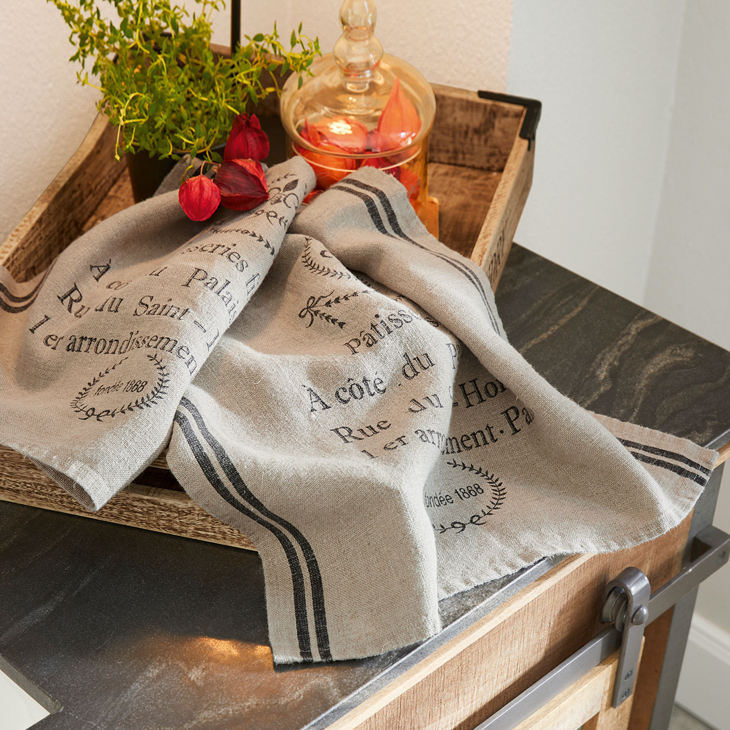 Zwei stilvolle Haushaltshelfer und eine schöne Geschenk-Idee für alle, die den Vintage-Chic lieben. Aus natürlichem Leinengewebe begeistert das Geschirrtuch-Set mit jener Noblesse, die man auch im Alltag gerne um sich hat. Denn auch in Zeiten moderner Materialien lässt sich das klassische Leinentuch durch nichts ersetzen. Großzügig im Format, flusenfrei und saugfähig erfüllen sie alle praktischen Aufgaben – so können Sie damit nicht nur Ihre Gläser streifenlos polieren, sondern sie auch als Brotkorb-Einlage oder zum Warmhalten der Frühstückseier für Ihren nächsten Brunch wunderbar einsetzen. Der aussagekräftige Letterprint versprüht französisches Flair und macht die Tücher zu einem attraktiven Blickfang. Ein vielseitiges Duo, das Ihre Küche optisch und funktional bereichert – auch auf jeder Tafel oder Buffet lassen sie sich perfekt einfügen.