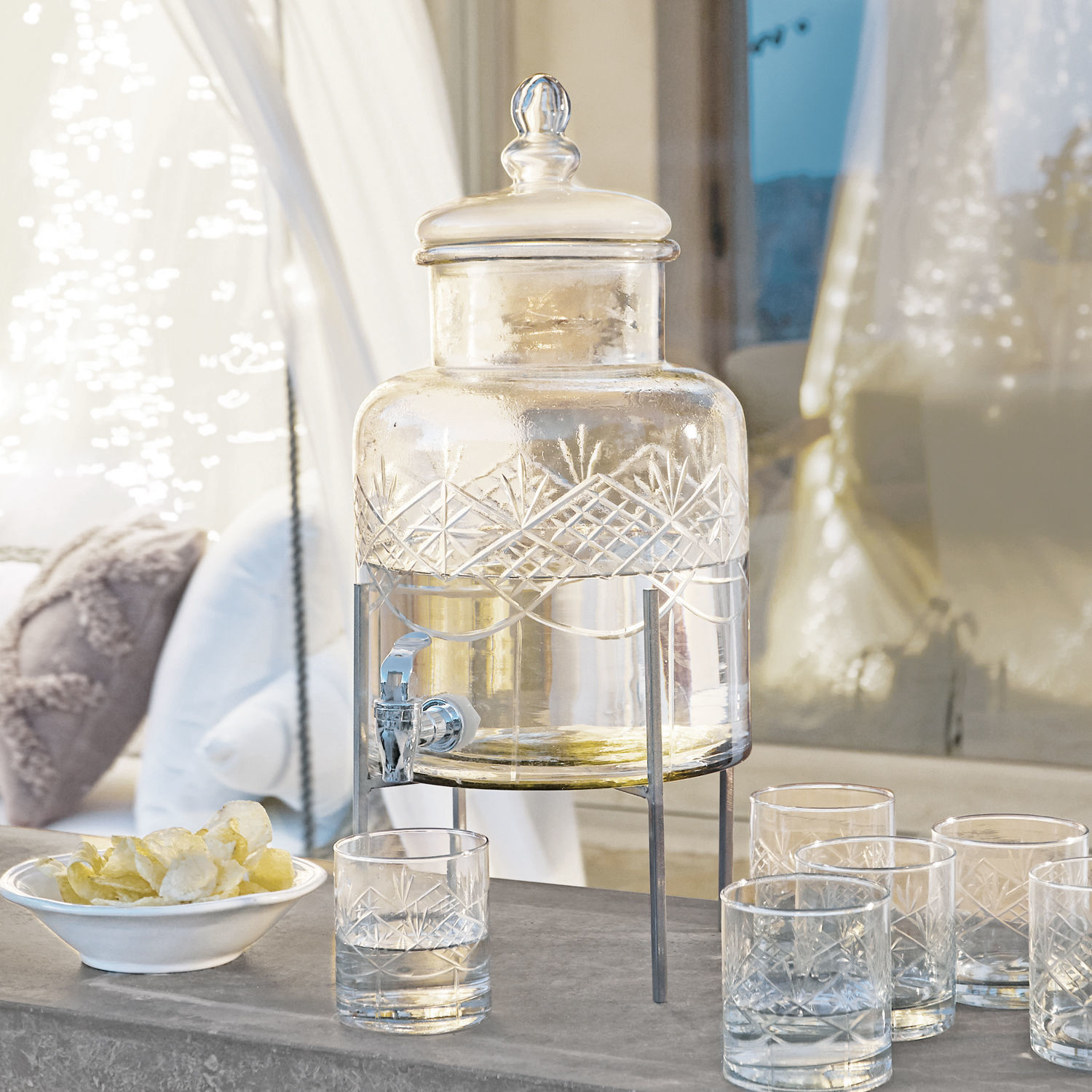 Dieser Getränkespender ist perfekt für Geburtstagsfeiern, Grillfeste im Garten und abendliche Partys. Er ist nicht nur ein herrlicher Blickfang, sondern er lädt den Gastgeber dazu ein, kreative Rezepte auszuprobieren und die Gäste können sich bequem selbst bedienen. Sie schlagen also zwei Fliegen mit einer Klappe. Er fasst ganze sieben Liter und kann während der Nutzung immer wieder nachgefüllt werden. Einfach die Glaskappe abnehmen und flüssige Leckereien eingießen. Der komplette Getränkespender ist aus Glas gefertigt und steht auf einem vierbeinigen Eisengestell. Der kunstreiche Schliff glänzt mit raffinierten Details und sorgt für eine charmante Vintage-Note. Das Gestell bietet praktischem Platz, um Trinkgläser ganz bequem unter der Öffnung abstellen zu können. Die dazu passenden Trinkgläser finden Sie unter der Artikelnummer 17544.