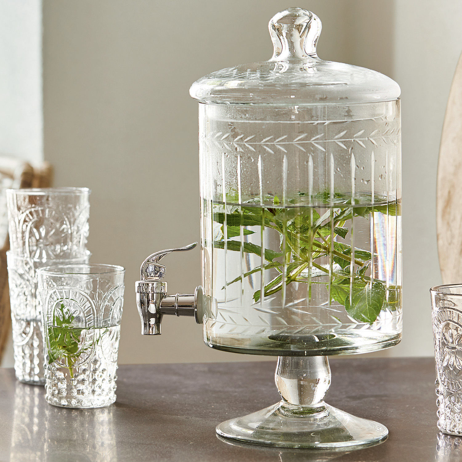 Sie möchten ihren Gästen selbstgemachte Limonaden oder Mix-Getränke auf stilvolle Art kredenzen? Voilá! Mit diesem handgemachten Getränkespender aus Glas, liegen Sie immer goldrichtig. Sein Fassungsvermögen liegt bei etwa drei Litern und er lässt sich ganz einfach nachfüllen. Deckel abnehmen, Zutaten einfüllen, Deckel aufsetzen und fertig! Der silbern schimmernde Zapfhahn ist aus korrosionsfreiem Kunststoff gefertigt und passt wunderbar zur feinen Reliefstruktur und den geschliffenen Mustern.