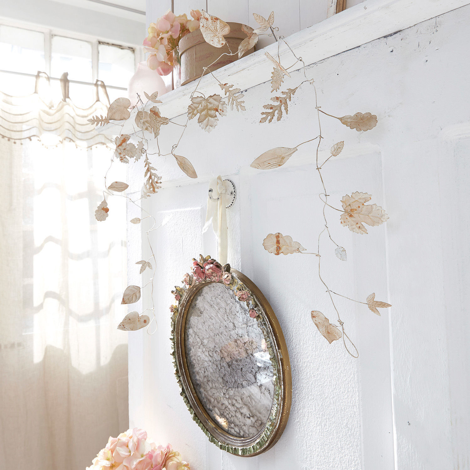 Eine filigrane und sehr dekorative Girlande aus Eisen. Die unterschiedlichen Deko-Blätter schimmern in diversen Tönen und sind detailreich geprägt. So wirken sie zugleich stilisiert wie auch naturnah. Das biegsame Gebilde lässt sich sehr flexibel zurechtdrapieren und ganz flexibel einsetzen. Ob am Fenster oder beispielsweise um einen Deckenbalken oder den Bettpfosten geschlungen – so holen Sie sich den Herbst und einen Hauch Natur nach Hause. Auch zu einem schmückenden Kranz lässt die Metallgirlande sich wunderbar biegen.