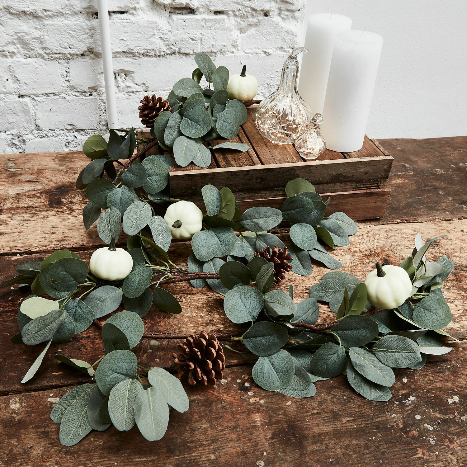 Fangen Sie die Schönheit des Herbstes ein und lassen Sie dem Kürbis als das Herbst-Symbol überhaupt den großen Auftritt. Bei dieser reizenden Girlande ist er in Form hübscher, kleiner Deko-Kürbisse vertreten. Dazu gesellen sich echte Tannenzapfen und weiche Deko-Blätter. Die großzügige Girlande lässt sich wunderbar um eine Kaminkonsole, am Fenster oder auch um den Türrahmen drapieren – hier können Sie völlig kreativ werden. Zum Beispiel zum Landhaus-Stil gelingt hiermit ein sehr harmonischer Effekt, der jedes Ambiente verschönert. Die niemals welkende Girlande können Sie jahrelang immer wieder verwenden, ohne dass sie an Frische verliert. Sie ist immer eine Freude.