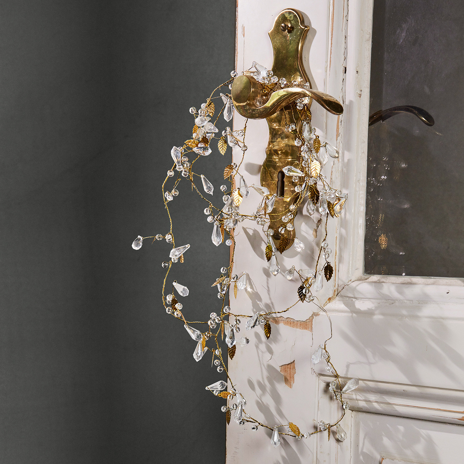Eine wunderhübsche Girlande, die mit klaren Kügelchen, Deko-Diamanten und feinen Blättern aus Acryl verziert ist. Die lange Schnur aus Messing ist dekorativ eingedreht. Die großzügige Länge ermöglicht Ihnen ganz individuelle Arrangements – vielleicht um den Türrahmen herum, im Fenster, an einer Kaminkonsole oder am Dachbalken oder um das Bettgestell geschlungen. Hier können Sie Ihrer Phantasie freien Lauf lassen. Das schöne naturnahe Design bringt auf stilvolle Art und Weise den Zauber der winterlichen Natur in Ihre Räume. Genießen Sie heimelige Momente in Ihrem ganz persönlichen Winterparadies.