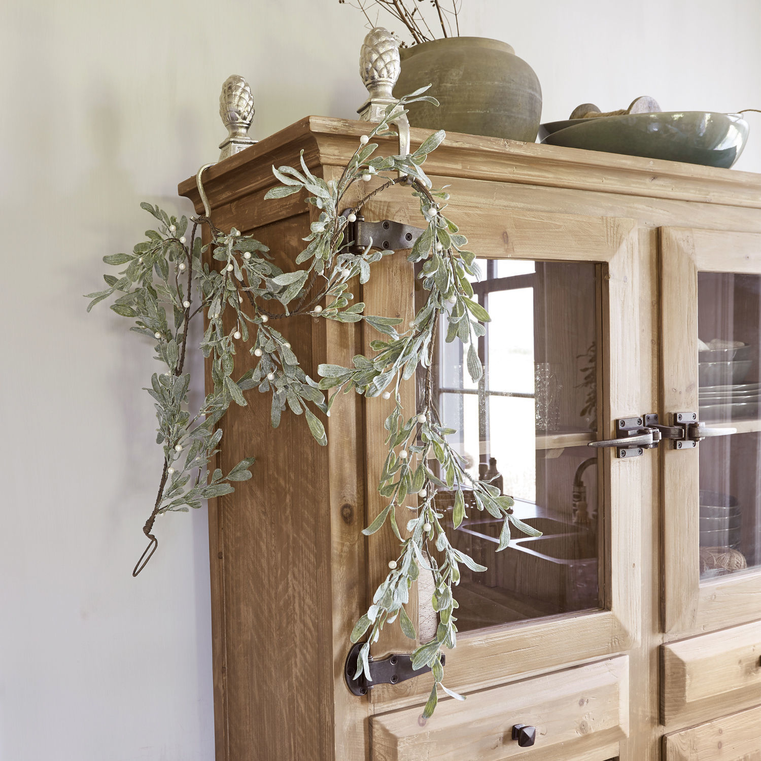 Mit Girlanden kann man im Handumdrehen eine faszinierende Wirkung erzielen. Besonders wenn sie so fantastisch interpretiert werden wie dieses Modell. Die kunstvoll gefertigten Mistelblätter sehen ihren Vorbildern aus der Natur zum Verwechseln ähnlich. Dazu gehören auch die prallen Scheinbeeren, die ebenfalls täuschend echt wirken und dekorative Akzente setzen. An einen beweglichen Draht gebunden, formieren sie sich zu einem vielseitigen Dekostück, das eine wunderbare Natürlichkeit ausstrahlt. Eine praktische Aufhängeschlaufe rundet die Kunstgirlande ab. Ihren Gestaltungsideen sind keine Grenzen gesetzt: Dekorativ an das Fenster, den Kamin oder das Treppengeländer im Flur angebracht verbreitet sie eine wunderbare vorweihnachtliche Atmosphäre. Als schmückender Mittelpunkt auf der Festtafel lädt sie Ihre Gäste zum stimmungsvollen Genießen ein.