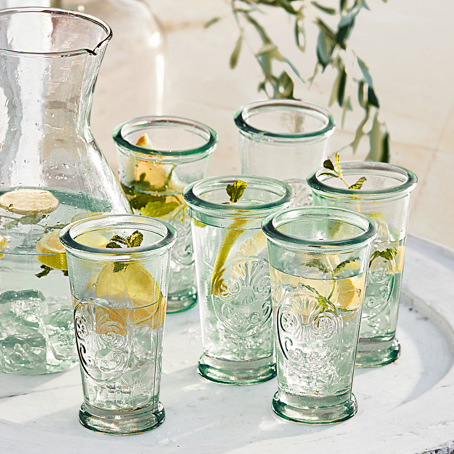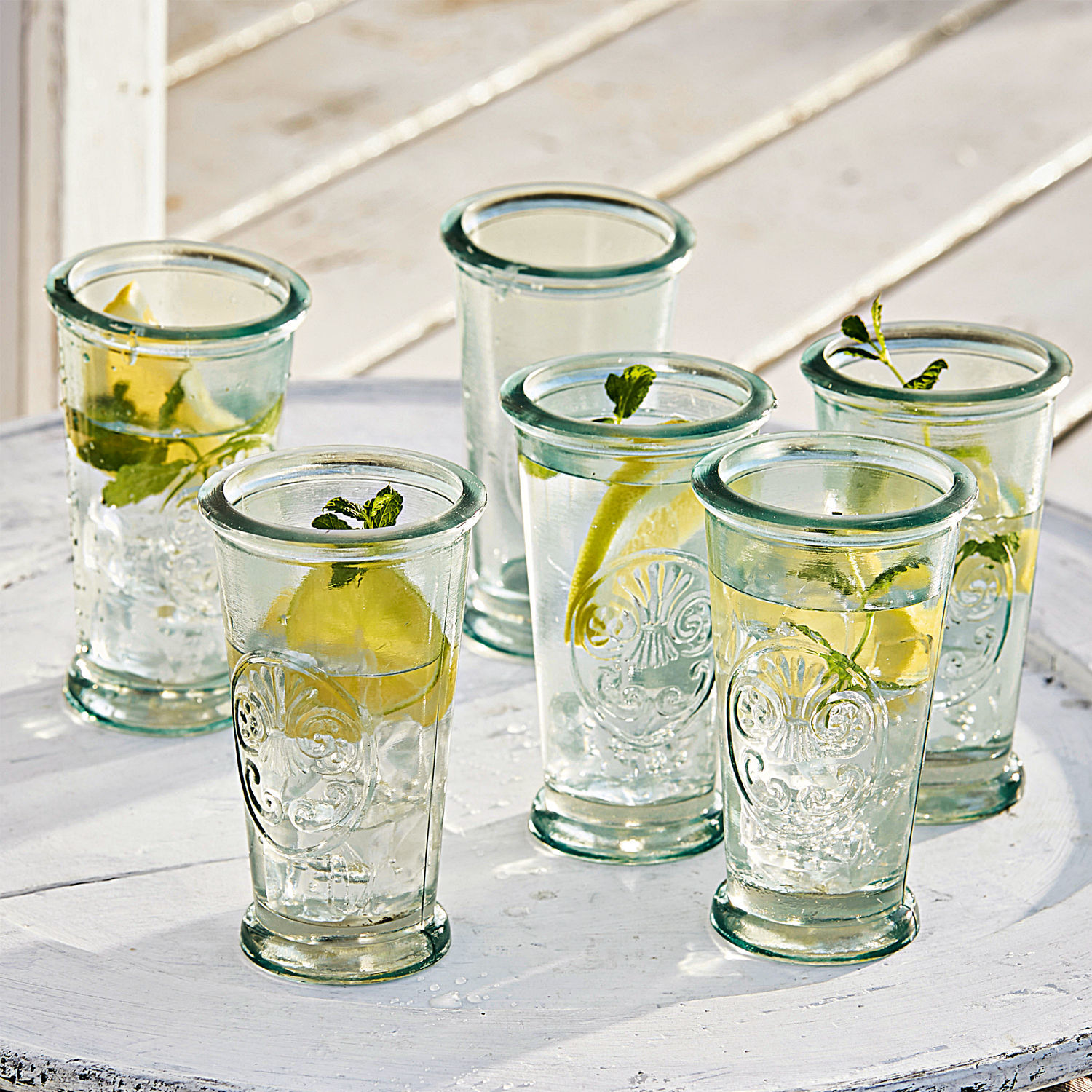 Dieses Set ist sehr besonders, denn es handelt sich um wiederaufbereitetes Glas aus nachhaltiger Produktion. Die neuen Gläser sind also aus vielen alten Gläsern aufwendig zusammengesetzt, was den dezenten Grünstich erklärt. Dieser erinnert auch an sehr alte Glasproduktionen aus vergangenen Zeiten. Ein wundervoller Effekt. Zusätzlich erhalten diese Gläser eine kunstvolle Prägung und machen sie sehr attraktiv für unterschiedlichste Anlässe. Das dickwandige Glas unterstreicht den rustikalen Touch und liegt sehr gut in der Hand. Obwohl diese Gläser einfache, klare Linien aufweisen, haben sie etwas unbestreitbar exotisches an sich. In einer Strandbar in Cuba würden sie definitiv nicht fehl am Platz wirken. Das Set enthält sechs Gläser und ist deshalb auch für kleine Familien ideal.