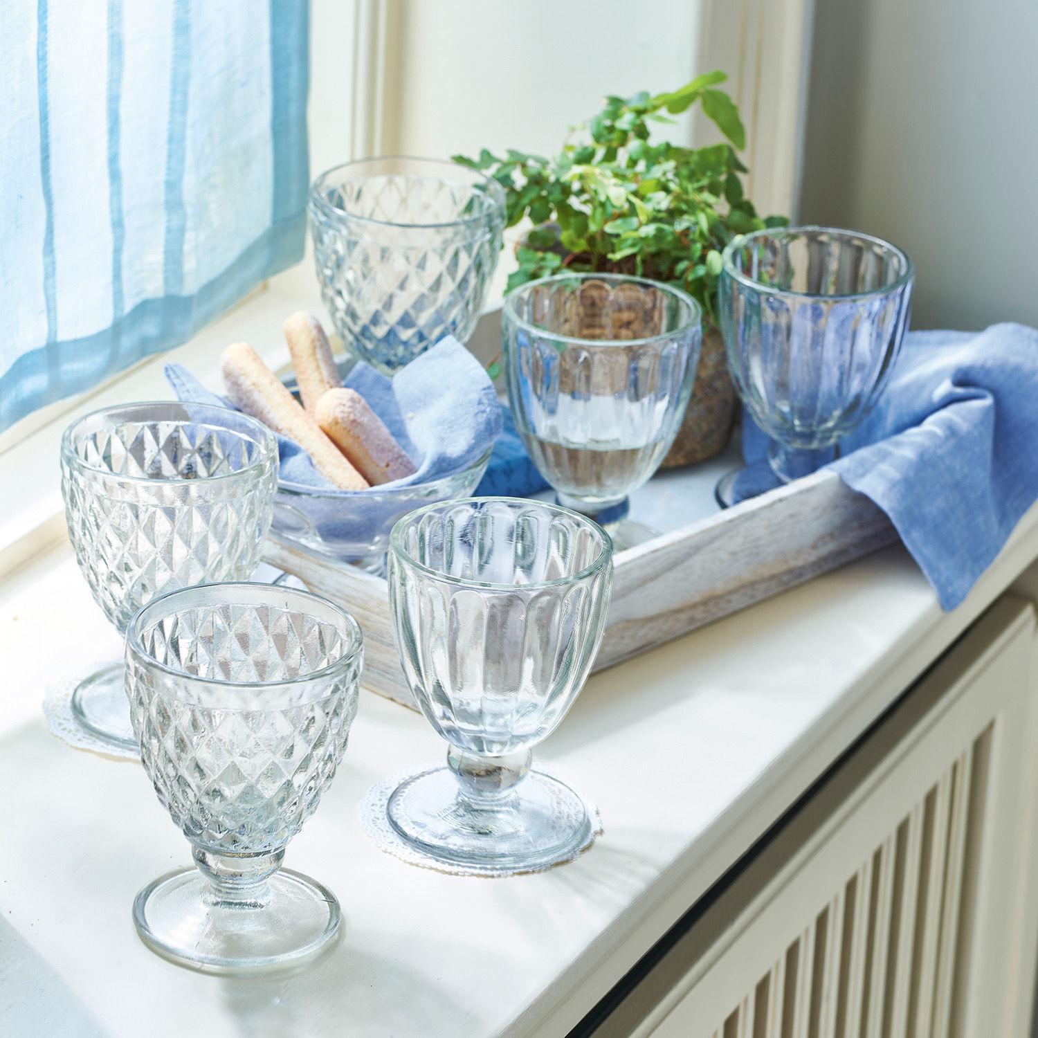 Kühles Wasser mit einer Scheibe Zitrone, eine erfrischende Limonade oder auch ein feiner Tropfen Wein schmecken aus diesen wunderhübschen Gläsern gleich noch ein bisschen besser. Die schönen Stücke bestehen aus Glas, das in zarte Aqua-Nuancen getaucht ist – einfach perfekt für die sommerliche Tafel. Zwei Designs mit Vintage-Anmutung mit Rillen- oder Wabenstruktur bringen romantisches Flair auf Ihren Tisch. Die attraktiven Gläser in Pokalform sind die perfekten Begleiter für ein gemütliches Essen, aber auch für gesellige Stunden mit Freunden. Ob beim Gartenfest oder zum Mittagsessen auf Balkon oder Terrasse – hiermit schmücken Sie gekonnt den gedeckten Tisch.