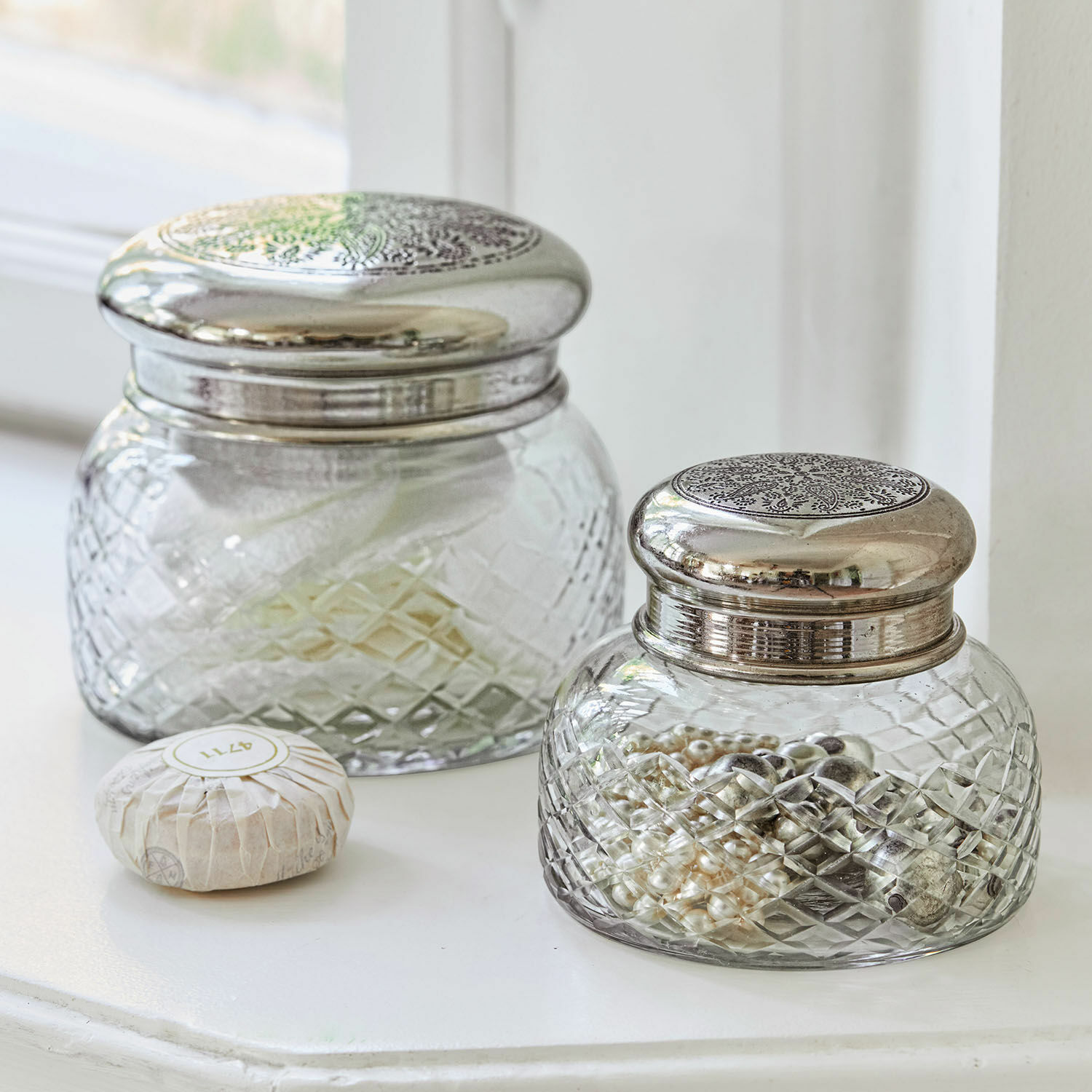 Nostalgie pur kommt mit diesen beiden wunderhübschen Dosen aus Glas und Stahl zu Ihnen nach Hause. Ein sehr feines, eingeprägtes Muster ziert den lose sitzenden Deckel, sowie ein edler Rautenschliff das Glas. Sie erhalten zwei Größen im Set. Diese beiden schönen Dosen sind sehr vielseitig verwendbar, etwa zu dekorativen Zwecken, wenn sie zum Beispiel mit einem Potpourri und anderen hübschen Fundstücken befüllt werden. Auch kleine Accessoires wie Schmuck oder Schlüssel finden hier ein Plätzchen, sowie auch eingepackte Süßigkeiten wie Bonbons. Diese beiden sehr ansehnlichen Multitalente haben einen authentischen Vintage-Charakter und sehen befüllt oder auch unbefüllt perfekt aus.