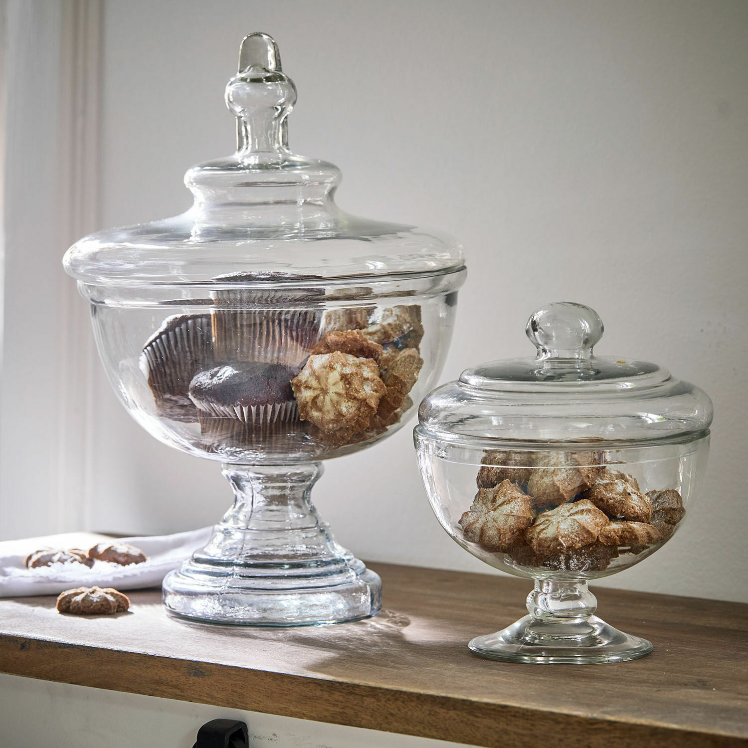 Diese beiden wunderschönen Dosen aus Glas kommen als Duo mit zwei nostalgischen Designs im Set zu Ihnen. Jede hat einen Deckel, sodass sich darin allerlei Dinge sicher und stilvoll aufbewahren lassen. Ob Dekoratives wie Trockenblüten, Schmuck oder kleine Leckereien, hierin sieht alles gleich noch viel schöner aus. Zumal zaubern die beiden Schmuckstücke mit feinem Standfuß einen Hauch der guten, alten Zeit in Ihr Heim, sodass sie bestens zum Shabby-Chic passen. In der Küche, im Bad oder als Dekoration im Wohnzimmer versprühen sie ihren Charme. Hiermit lassen sich immer wieder aufs Neue ganz zauberhafte Arrangements erschaffen – die beiden edlen Glasdosen sind ebenso nützlich wie auch dekorativ.
