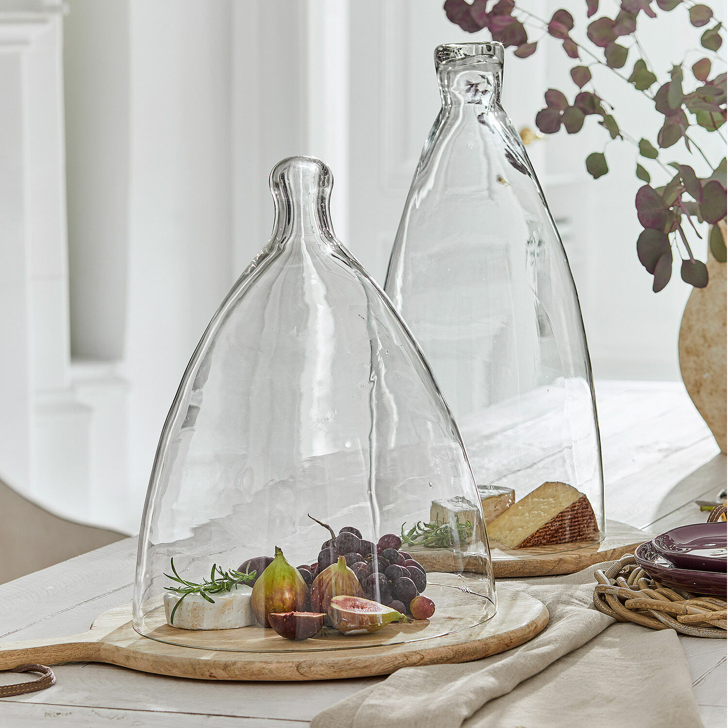 Schöner und individueller kann sich dieses Glasglocken-Set nicht präsentieren. Denn im Gegensatz zu den handelsüblichen Glocken zeigt sich dieses Duo mit ganz neuen ästhetischen Reizen. Dazu gehört nicht nur das relativ dickwandige Glas, sondern auch die außergewöhnliche Formgebung, die an lang gezogene Kuppeln erinnern. Obenauf thront ein origineller Glasknopf, der ihre Handhabung besonders leicht macht. Ihr rustikaler Charme ist unübersehbar und ihre unterschiedlichen Größen machen sie so vielseitig. So decken sie beispielsweise Holzplatten oder Dekoteller mit einem Durchmesser von 24 cm und 31 cm perfekt ab. Für welche Zwecke Sie die beiden Objekte einsetzen möchten, entscheiden Sie: So machen sie stimmungsvolle Deko-Arrangements zum stilvollen Hingucker oder setzen auf Ihrer Brunchtafel Käse oder kleines Gebäck perfekt in Szene. Auch ein tolles Geschenk für Freunde, die gerne Gäste einladen oder Spaß am Dekorieren haben.