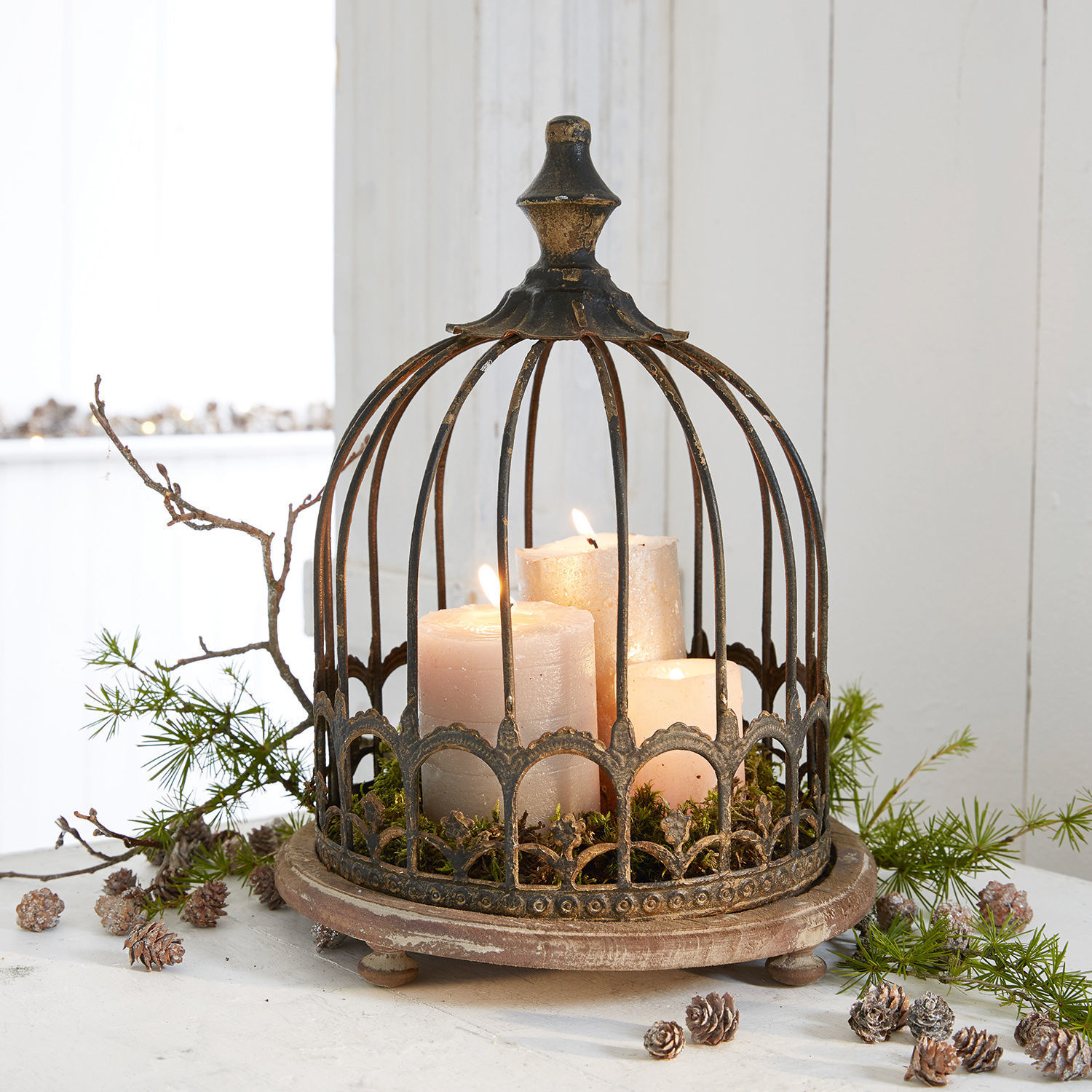 Ein wunderschönes Schmuckstück im stilvollen Shabby-Chic. Das edle Design besteht aus einer reich verzierten, romantischen Glocke aus Eisen. Sie ist abnehmbar und ruht auf einem Tablett aus Tannenholz. Ein Antik-Finish sorgt für eine schöne Patina und lässt das hübsche Stück wie aus früheren Zeiten erscheinen. Dazu harmonieren die zwei doch gegensetzlichen Materialien besonders hübsch miteinander. Perfekt für alle, die die Nostalgie lieben und einen zeitlosen Akzent setzen wollen. Lassen Sie das stilvolle Modell ganz pur wirken oder schmücken Sie es kreativ – saisonal sind hier immer wieder neue Kreationen möglich. Teelichter, Federn, edle Steine, Blumen und viele andere Lieblingsstücke lassen sich unter der Glocke kunstvoll arrangieren. Im Sommer könnten Muscheln ein Plätzchen darunter finden, im Herbst Mini-Kürbisse und im Winter Tannenzapfen und Lichterketten.