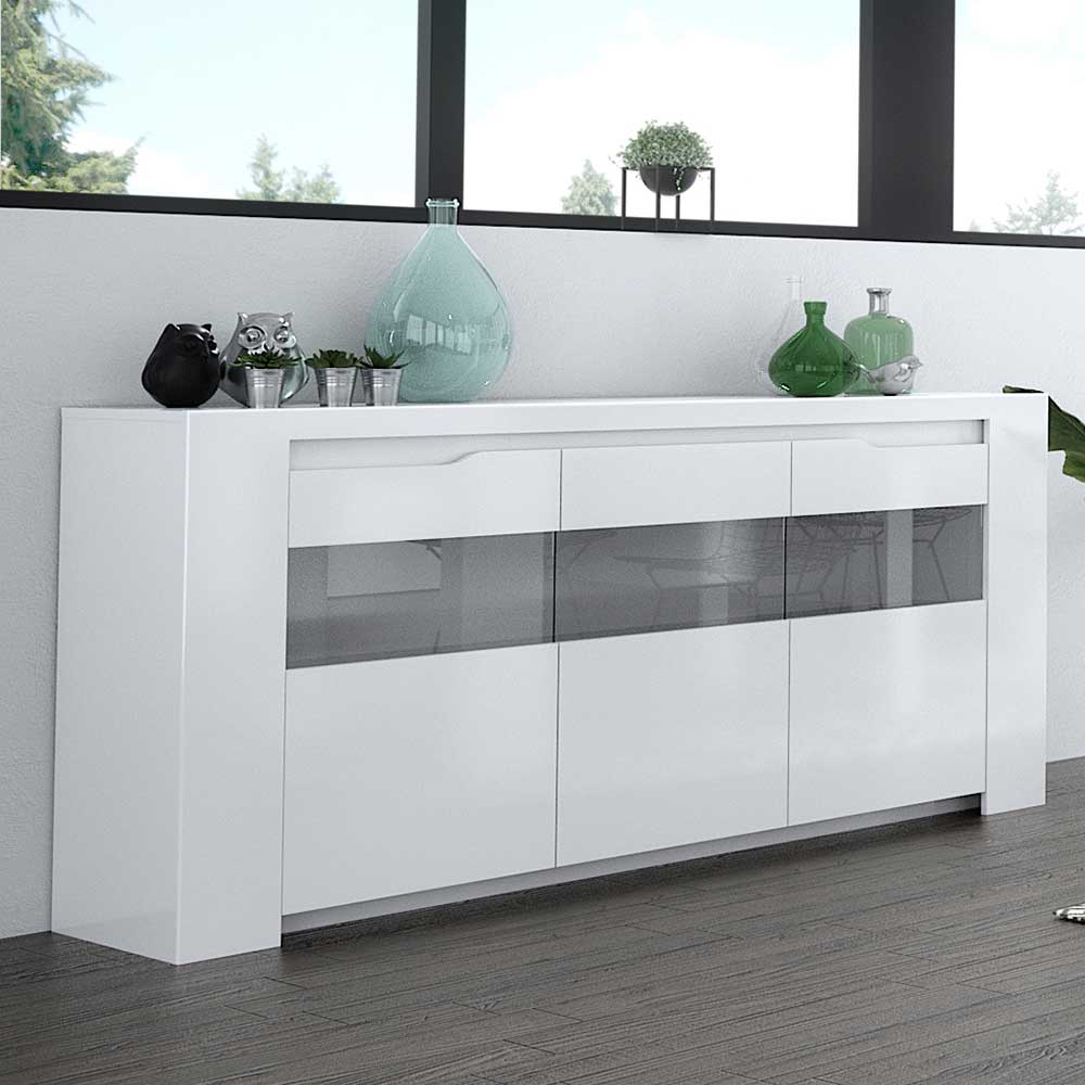– Sideboard Weiß – Wohnzimmerschrank Spanplatte und MDF – Kommode Modern – Sidebord Breite: 180 – Küchenkommode Höhe: 86 – Wohnzimmer schrank Tiefe: 42 – Wohnzimmer kommode Modernem Hochglanz – Große kommode Schrank-Tür: mit Drehtüren – Esszimmer kommode 3-türig (mit Türdämpfung), Innenaufteilung: mit Einlegeböden – Wohnzimmerkommode LED Beleuchtung – Esszimmerkommode Zerlegt, zum leichten Selbstaufbau (Montageanleitung liegt bei) – Küchensideboard Sockelgestell – Hochglanzsideboard Griffmulden – Esszimmersideboard Rechteckige Form – Glas Tür – Energieeffizienzklasse: LED – Griff Form: Griffmulde
