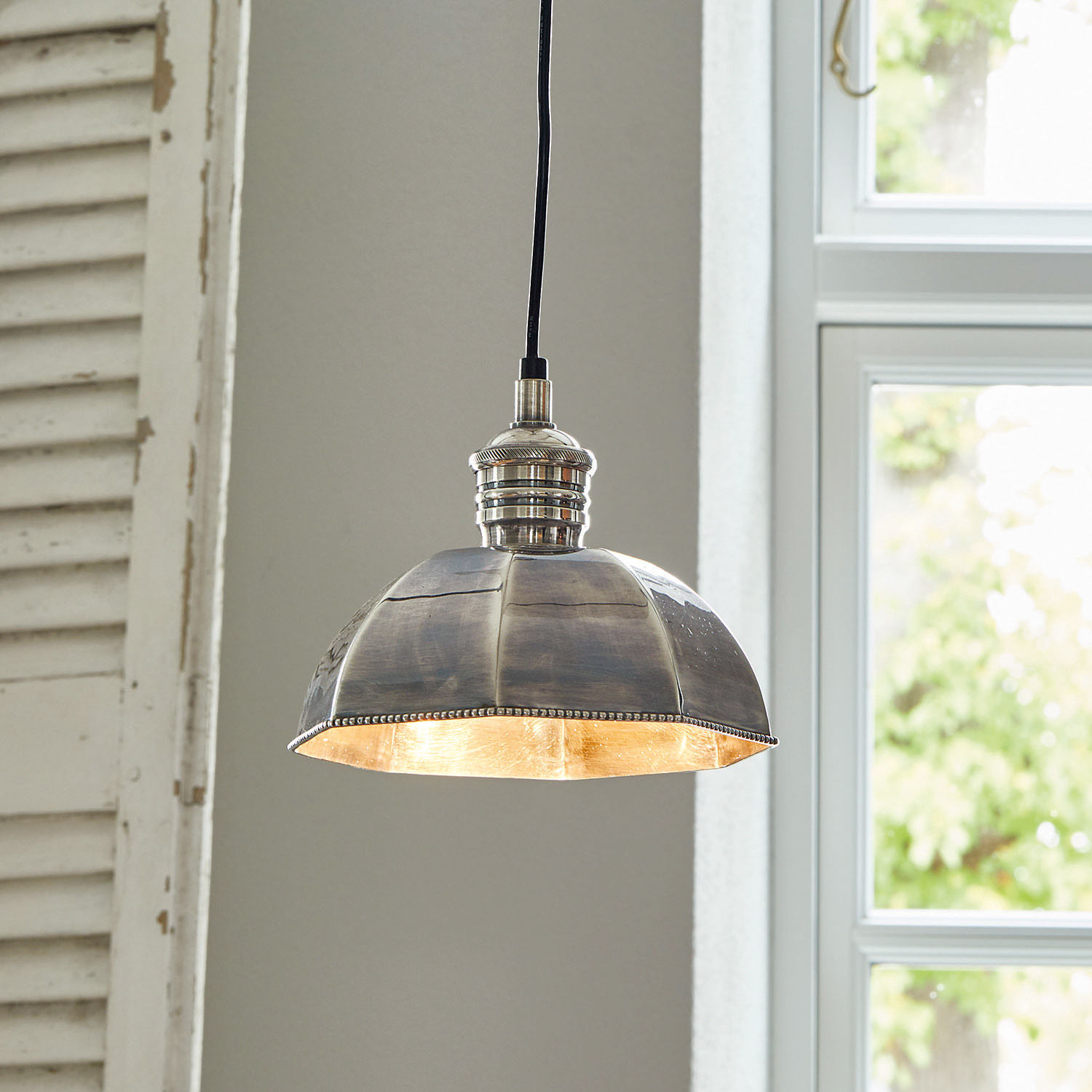 Dass es sich bei dieser Hängeleuchte um ein außergewöhnliches Schmuckstück handelt, erkennt man auf den ersten Blick. Der Rand des kunstvoll geformten Messingschirms weist ein raffiniertes Perlenrelief auf, das perfekt mit dem Antiksilber-Finish harmoniert. Der feine Schimmer der Oberfläche gewinnt im Laufe der Zeit eine bezaubernde Patina. Mit jedem Jahr wird dieser elegante Lichtspender also noch schöner und zu einem echten Unikat. Auch der Baldachin wurde aus Messing gefertigt und perfekt ans Design angepasst. Die klassische Formsprache erhält durch diesen dezenten Glanz eine zeitlos elegante Note. Kurz: Mit dieser Hängeleuchte lassen sich Ästhetik und Stimmung jedes Raumes deutlich aufwerten.