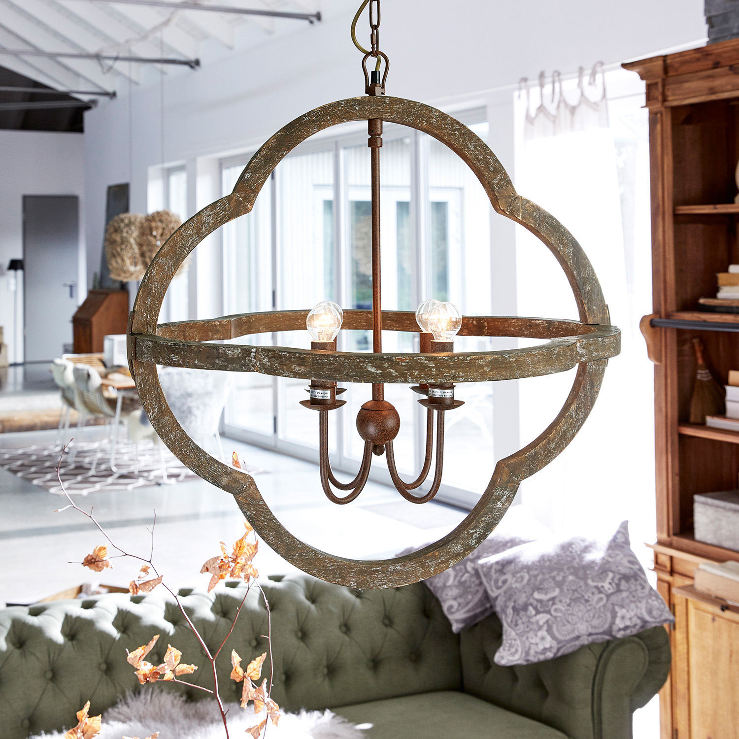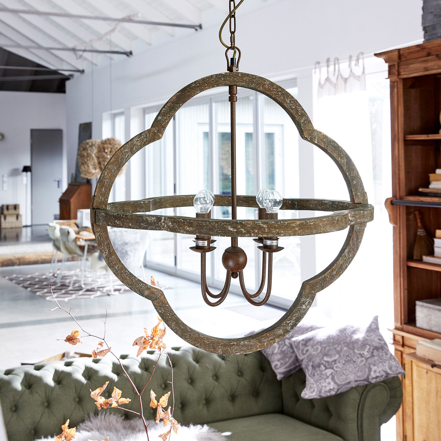 Ein echtes Highlight – diese luxuriöse und aufwendig gestaltete Lampe ist in einem außergewöhnlichen Design mit rustikalem Farmhouse-Charakter gehalten. Ein Anblick, den man sicherlich noch nicht oft gesehen hat und perfekt für alle, die individuelle Accessoires schätzen. Das wertvolle Modell besteht aus gemasertem Holz mit hübscher Struktur, welche durch das Antik-Finish betont wird, sowie aus Eisen. Ein interessanter Materialmix, der gut zum Landhaus-Stil passt. Die attraktive Lampe ist höhenverstellbar aufzuhängen, sodass Sie flexibel sind. Sie macht über dem Esstisch, in der Küche oder im Wohnzimmer eine sehr gute Figur und spendet dank vier Leuchtmittel helles, angenehmes Licht. Und auch wenn das Licht aus ist, gibt sie eine wunderschöne Dekoration für Ihr Zuhause ab.