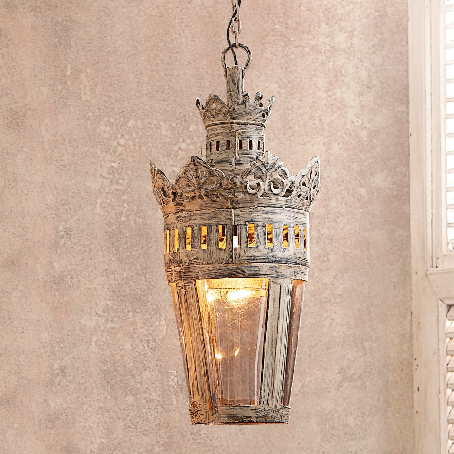 Die Hängelampe im Laternen-Stil wurde aus Metall und Glas gearbeitet und aufwändig verziert. Ein Antikgraues Finish unterstreicht die historische Anmutung. Mit […]