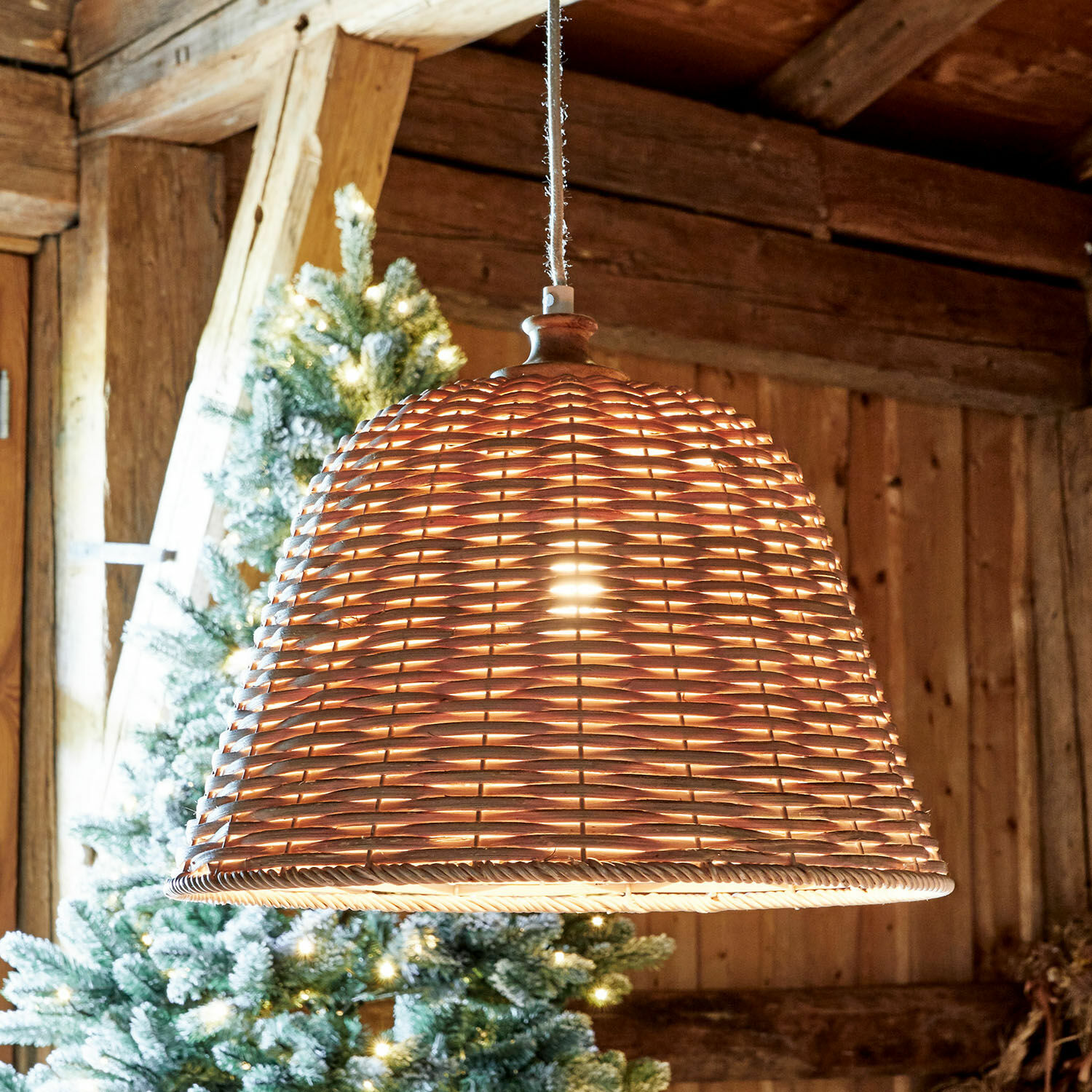 Träumen Sie sich in den letzten Urlaub zurück oder nehmen Sie im Liegestuhl ein Buch zur Hand und hüllen Sie Ihr Wohnambiente in sanfte Helligkeit. Genießen Sie entspannte Stunden in dem wohligen Licht-Refugium dieses stilvollen Schmuckstücks. Oder akzentuieren Sie Ihre schönsten Skulpturen, Möbel oder Blumenarrangements mit den sanften Strahlen dieser schicken Hängelampe, die ein Sinnbild höchster Qualität ist: Der Rattan-Schirm wurde mit großer Sorgfalt von Hand geflochten, die Fassung ist aus langlebigem Mangoholz mit ganz reizenden, natürlichen Maserungen und der Baldachin besteht aus robustem Eisen und ist in kontrastreichem Weiß gehalten. Verzaubern Sie sich und Ihr Zuhause mit diesem lichtbringenden Schmuckstück, das in jedem Wohnambiente Akzente setzt. Ein Leuchtmittel ist nicht im Lieferumfang enthalten, so können Sie selbst etwas Passendes aussuchen.