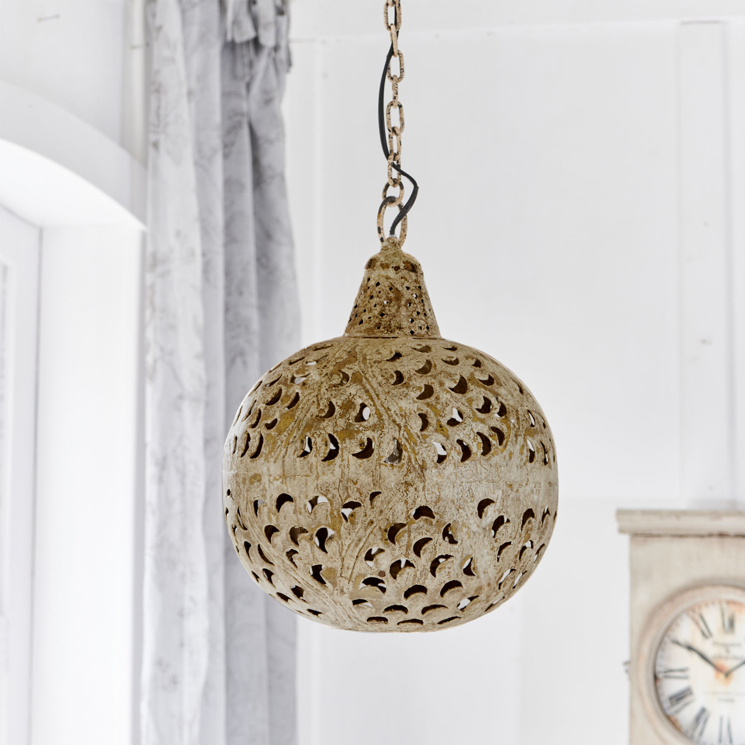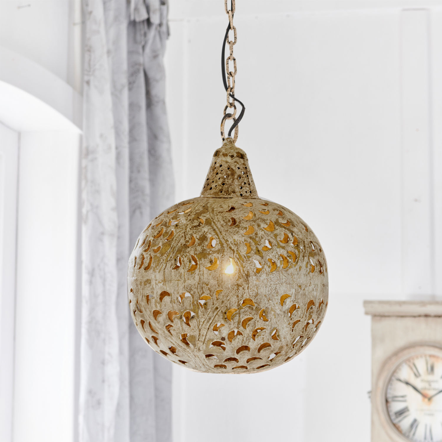 Mit dieser Pendelleuchten können Sie schnell und unkompliziert spannende Kontraste setzen. Ihr außergewöhnliches Design wirkt absolut zeitlos und harmoniert mit den unterschiedlichsten Interieurs. Das Schmuckstück ist aus reinem Eisen geformt und mit vielen sichelförmigen Öffnungen versehen, die für eine herrliche Lichtstimmung sorgen. Die Oberfläche wurde aufwendig per Handarbeit behandelt und verleiht der Leuchte echten Unikat-Charakter.