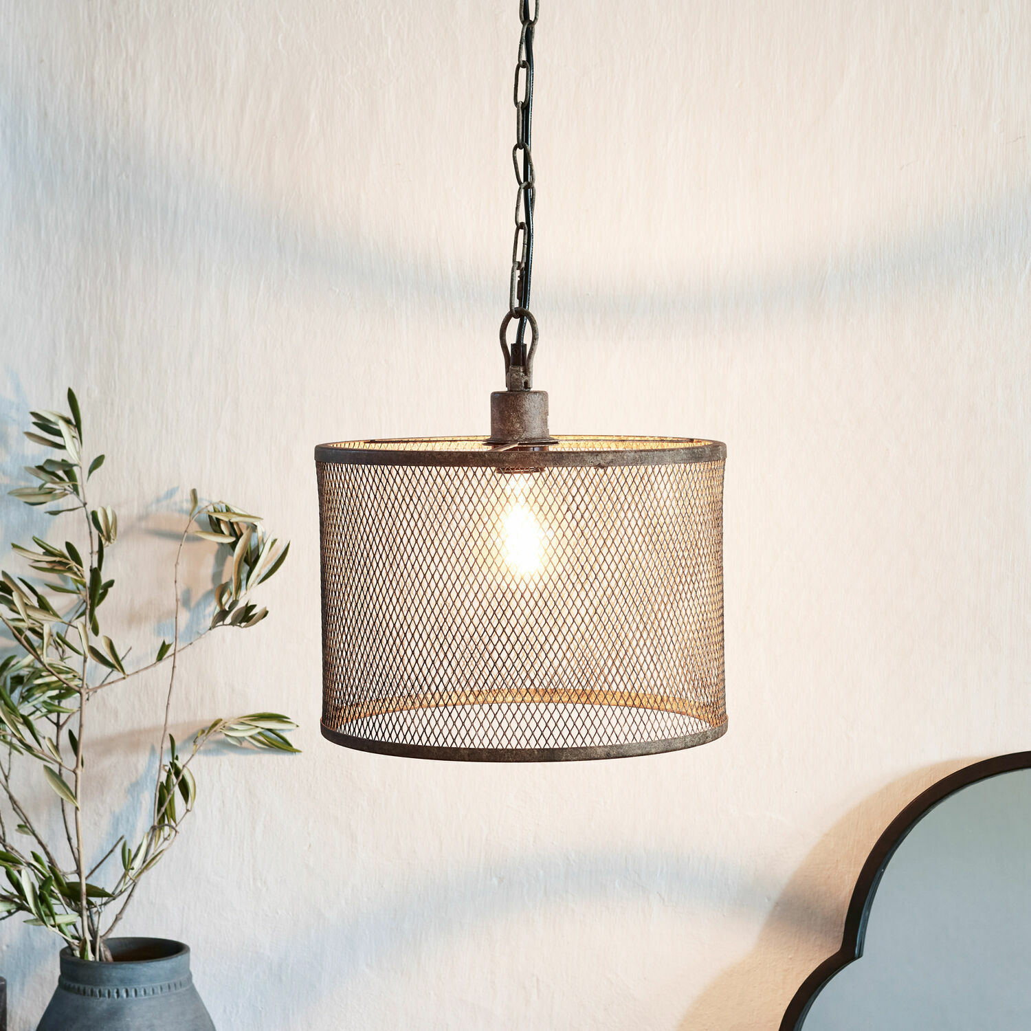 Ist es nicht immer wieder faszinierend, welche verschiedenen Formen ein erfahrener Metallkünstler dem harten Material Eisen abringen kann? Für diese Hängelampe hat er zuerst zwei massive Eisenringe über dem Feuer geschmiedet und zwischen diese dann ein filigranes Gitter in klassischem Rautenmuster gespannt. Von weitem betrachtet, wird man es kaum glauben: Auch dieses Gitter wurde aus eigentlich schwerem Eisen gefertigt, es wirkt aber so luftig-leicht und transparent wie ein großmaschiges Gewebe. Diese Schwerelosigkeit erlaubt es der Hängelampe, sich wunderbar harmonisch in die verschiedensten Raumsituationen einzufügen. Aber nicht nur ihre Optik ist einzigartig, auch als Lichtquelle unterscheidet sich die Lampe von vielen anderen. Denn anders als zum Beispiel Lampen mit geschlossenem Metallschirm, die das Licht gezielt nach unten lenken, kann hier das Licht ungehindert durch das feine Gitter des Schirms fallen und sich großzügig im Raum verteilen. Die dunkelbraune Patina schließlich lässt die Hängelampe älter erscheinen als sie wirklich ist, denn der warme Farbton erinnert an Edelrost, was ihr die ehrwürdige Aura eines antiken Klassikers verleiht.