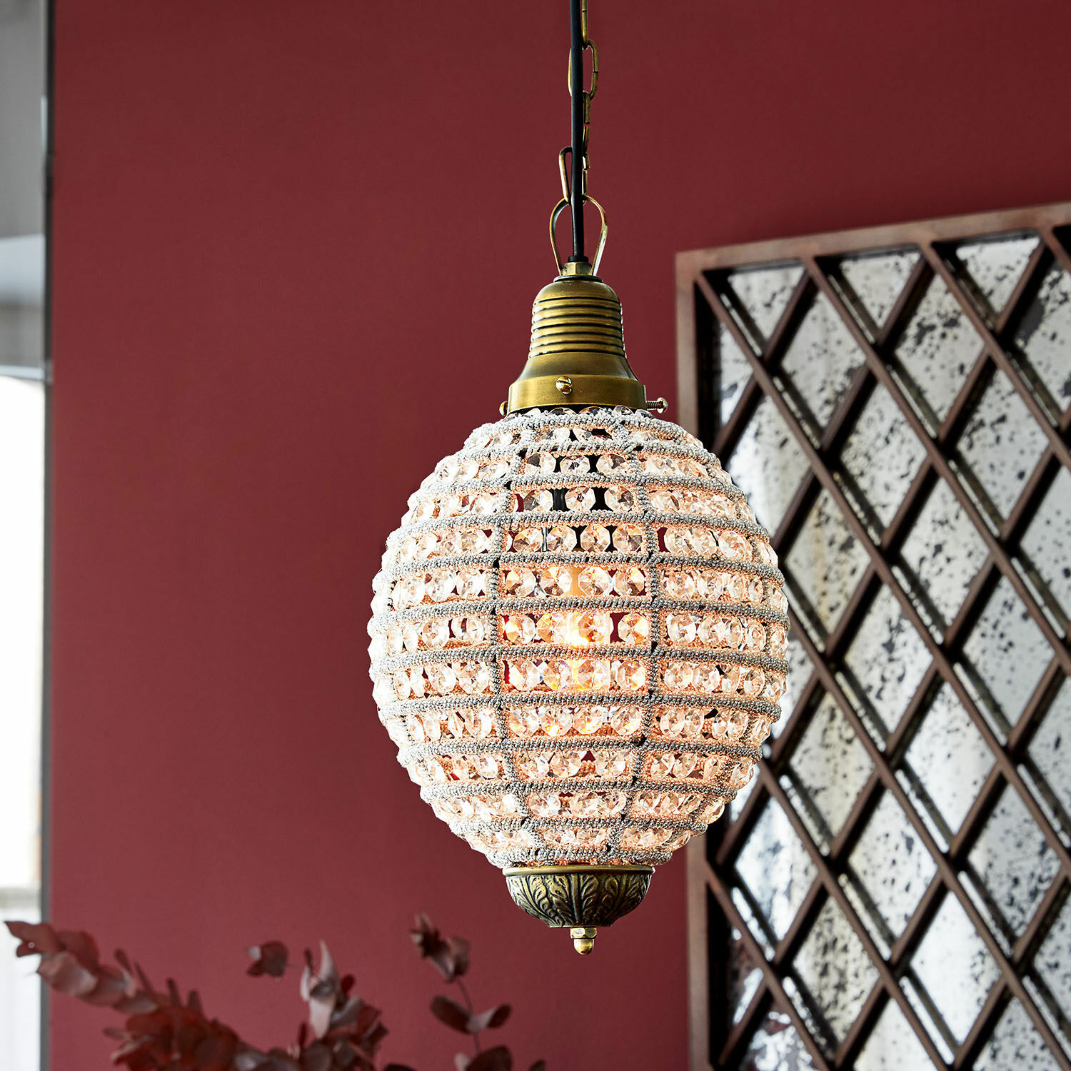 Glas ist von besonderer Faszination für Licht-Designer. Denn kunstvoll geschliffenes Glas fängt das Licht ein und funkelt wie ein kostbarer Edelstein, wenn das Licht durch die Facetten reflektiert wird und manchmal sogar die schillernden Farben eines Regenbogens aufblitzen. Und jetzt stellen Sie sich vor, dass Licht nicht auf ein einzelnes Stück geschliffenes Glas trifft, sondern auf die unzähligen Glasprismen und Perlen an dieser Hängelampe und ein glamouröses Funkeln Ihr Ambiente stimmungsvoll erleuchtet. Diese Lichteffekte können Sie je nach Raumsituation vielleicht schon bei Tag beobachten, wenn Sonnenstrahlen auf die Hängelampe treffen. noch faszinierender aber ist das Lichtspiel am Abend, wenn das Licht aus dem Inneren sanft gedämpft durch die dicht an dicht hängenden Glasprismen in den Raum fällt. Korpus und Baldachin der Hängelampe wurden kunstvoll in klassischer Tropfenform aus Eisen mit Aluminium gestaltet, die üppige Verzierung mit den funkelnden Glasprismen und -perlen ist in reiner Handarbeit gefertigt. Das Finish der Metallelemente in Antikmessing vollendet den nostalgischen Look. Als Leuchtmittel empfehlen wir Ihnen eine energiesparende LED-Lampe, dann können Sie die faszinierenden Lichtspiele der Hängelampe noch unbeschwerter genießen.