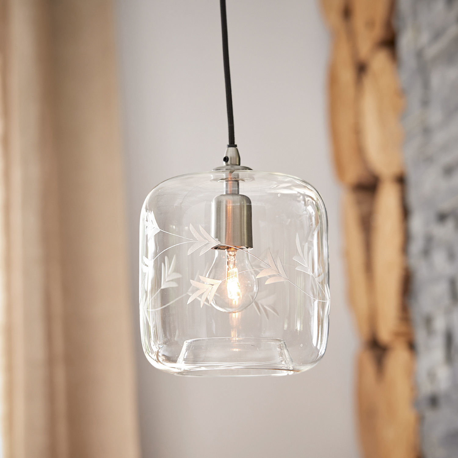 Für den Charakter und die Ausstrahlung eines Interieurs ist neben der Möblierung vor allem eines ausschlaggebend: die Beleuchtung, für die wir uns entscheiden. Dabei bestimmt die Lichtfarbe, wie hell oder gemütlich es im Umfeld einer Leuchte ist, während ihr Design unseren ganz persönlichen Stil ausdrückt. Diese edle Hängelampe beherrscht eindeutig das Spiel der leisen Töne. Verwöhnt sie ihren Betrachter doch mit ihrem schlichten, sanft gerundeten Lampenschirm aus Klarglas. Dieser allerdings schmückt sich wirkungsvoll mit einem kunstvollen, filigran wirkenden Schliff aus floralen Elementen, die sich verspielt um die Mitte der gläsernen Form ranken. Auf diese Weise zaubert die Hängelampe ein besonders angenehmes Lichtspiel in den Raum und macht sie auch am Tag zum attraktiven Blickfang. Ganz gleich also, ob Sie dieses erlesene Stück über Ihrem Esstisch wirken lassen wollen, es über dem Couchtisch strahlen darf oder das Schlafzimmer oder der Flur sein Bestimmungsort sein soll – Sie werden den Anblick dieser exquisiten Hängelampe jeden Tag aufs Neue genießen. Befestigt wird die Lampe mit Hilfe einer schönen Eisenfassung an der Decke, so dass sie im Dunkeln im Raum zu schweben scheint.
