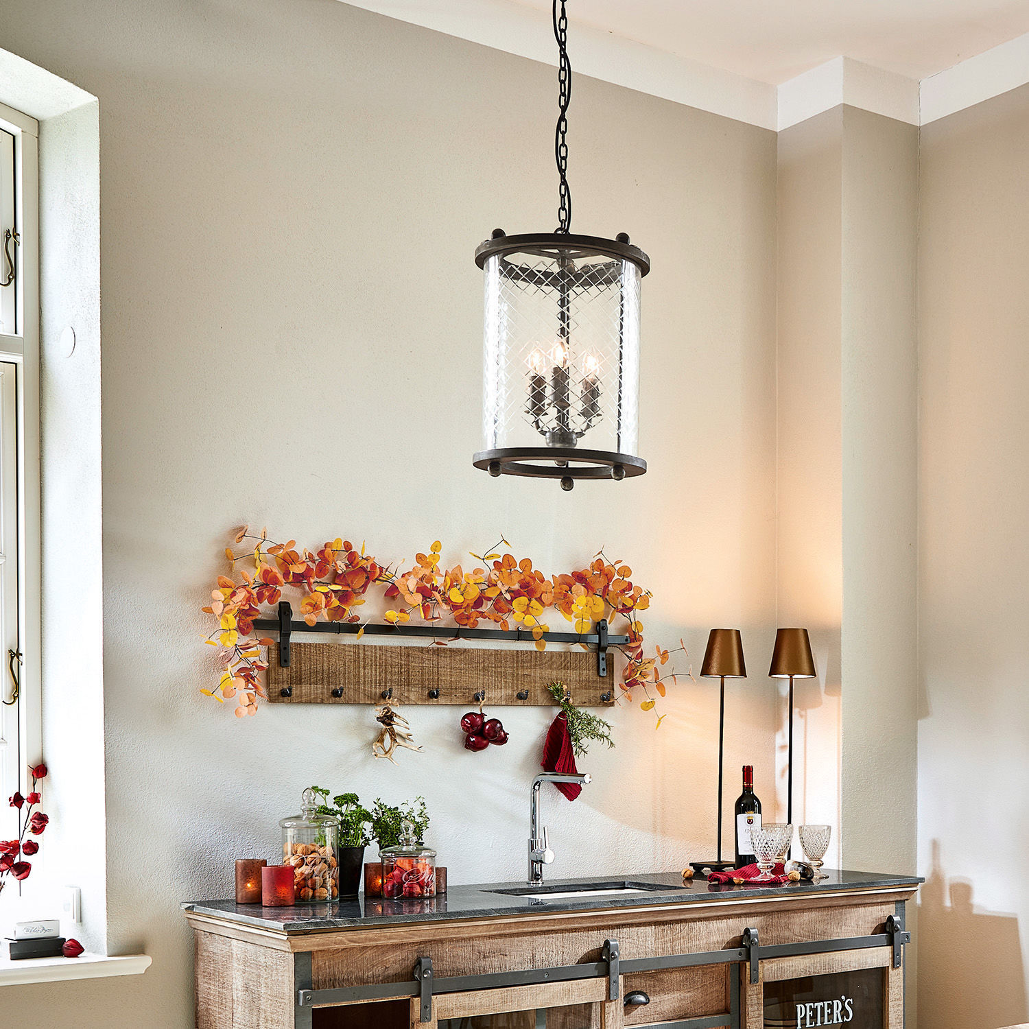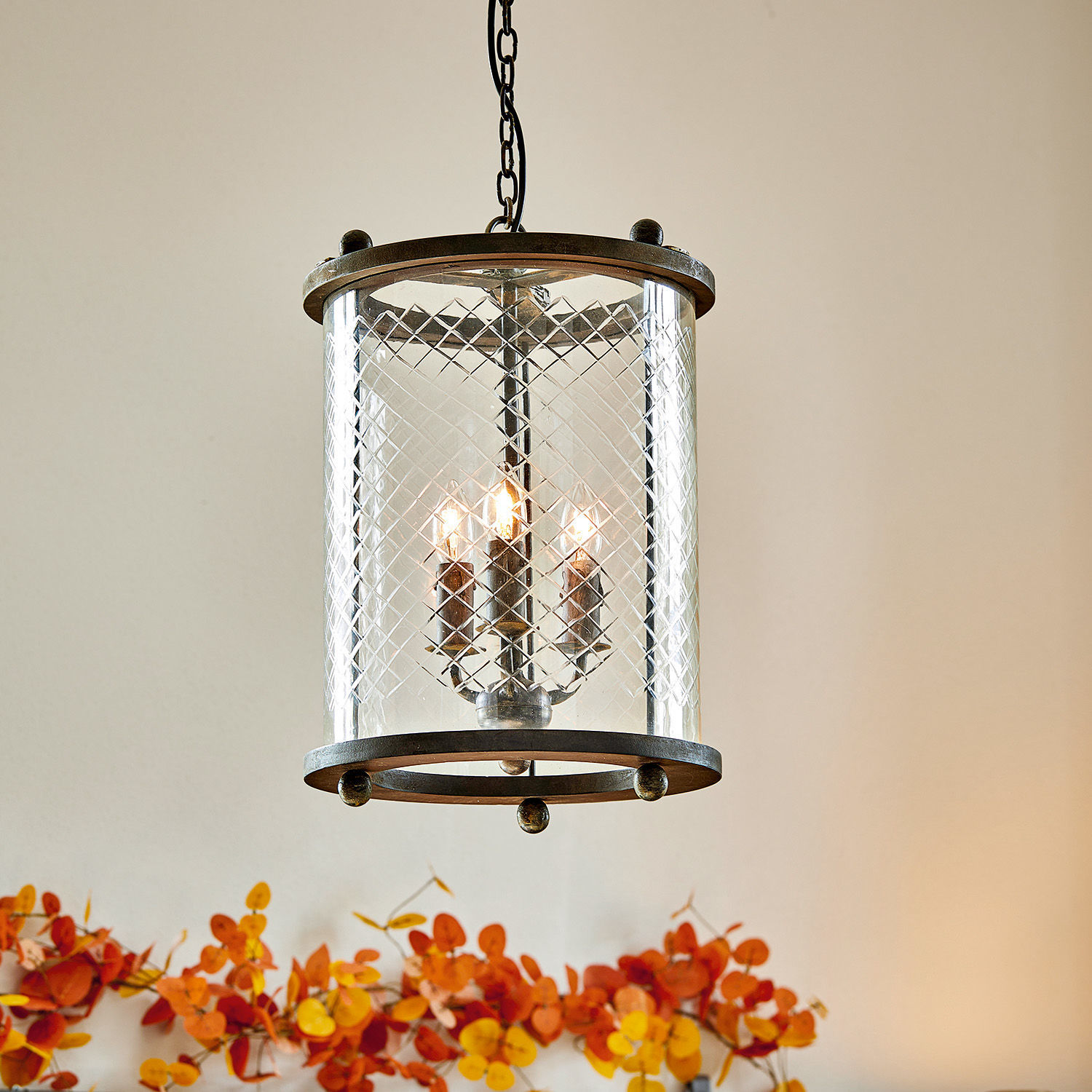 Lampen sind nicht nur Lichtquellen, die einen Raum beleuchten, sondern immer auch Ausdruck des persönlichen Stils. Wer sich dabei für schlichte Formen in Zusammenspiel mit raffinierten Details entscheidet, outet sich als ein Individualist, der in keine starre Form gepresst werden möchte. Und für den vielleicht diese exquisite Hängelampe die Erfüllung seiner Wünsche ist. Der Lampenschirm besteht aus einem Zylinder aus klarem Glas, der aber am oberen und unteren Rand von einem schmalen Ring aus Holz umschlossen wird. Ein feines, aber nicht weniger eindrucksvolles Design-Element ist das handgeschliffene, gitterartige Muster, was für interessante Lichteffekte sorgt, wenn am Abend das Licht aus dem Inneren der Lampe fällt. Auch die drei Lampenfassungen im Glaszylinder sind mit Liebe zum Detail gestaltet: Sie befinden sich auf drei kleinen Armen, die sich aus einer Kugel recken. Aufgehängt wird die Hängelampe mit Hilfe einer rustikalen Kette, die typisch ist für Lampen aus der Zeit ohne überall verfügbaren Strom. Und wie für viele einzigartige Wohn-Accessoires gilt auch für diese Hängelampe: Sie lässt sich in die verschiedensten Raumsituationen integrieren. Über dem Esstisch oder über einer Kommode, im Wohnraum und auch im Flur – immer wird sie im Rampenlicht stehen, bei Tag wie am Abend.