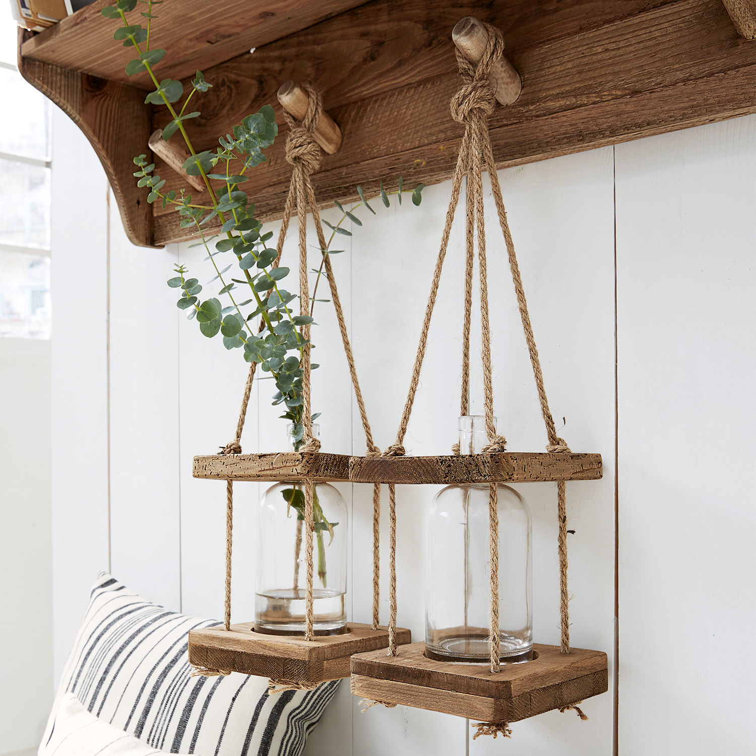 Zwei außergewöhnliche Deko-Objekte, die in Ihrem Wohnraum, aber auch draußen auf Balkon und Terrasse viel Stimmung verbreiten. Eine formschöne Flasche aus Klarglas bildet hierbei den Mittelpunkt, gehalten von zwei Platten aus wiederaufbereitetem Kiefernholz, dessen begehrte, natürliche Patina den einzigartigen Charakter bestimmt. Vier Seile aus robustem Hanf machen die Hängeampel komplett. Eine gelungene Mischung von Materialien, die diesem Set eine natürliche Anmutung und gleichzeitig stilvollen Ausdruck verleiht. Zu jeder Jahreszeit lassen sie sich individuell schmücken – ob mit Gräsern, Blüten, Federn oder Zweigen. Ihrem kreativen Spielraum sind keine Grenzen gesetzt. Zum lässig eleganten Hamptons-Style, rustikalen Landhaus-Chic oder mediterranen Look harmonieren diese Accessoires besonders schön.