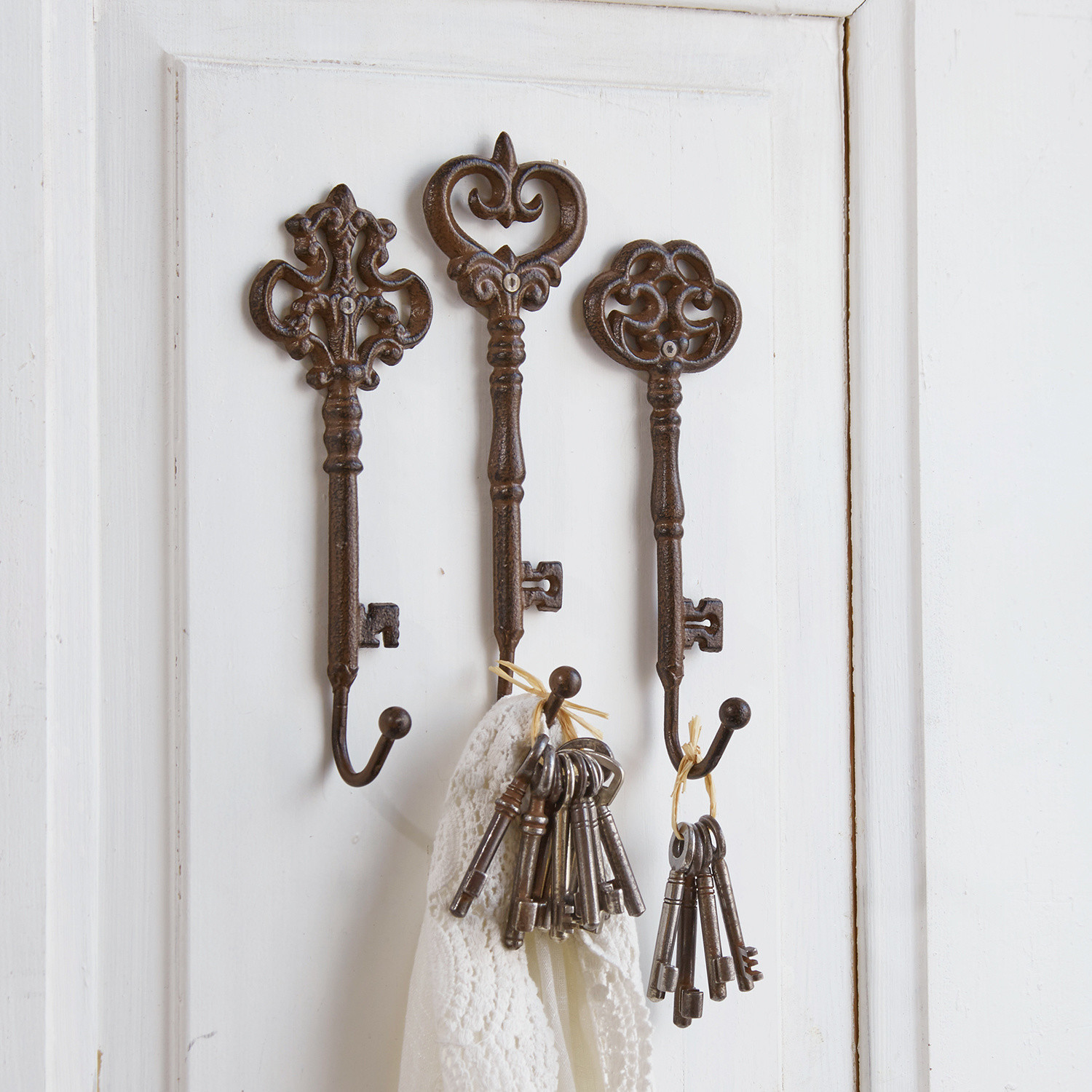 Ein wundervoll nostalgisches Trio mit authentischem Charakter. Die drei kunstvollen Haken im Stil altertümlicher Schlüssel erscheinen wirklich wie aus alten Zeiten. Sie bestehen aus Gusseisen mit Antik-Finish. Im Set erhalten Sie drei Größen und unterschiedliche Designs. Die Schmuckstückchen lassen sich an der Wand festschrauben und leisten hier gute Dienste. In Küche und Bad, um Handtücher aufzuhängen, im Flur für den Schlüsselbund, für Kräutersträuße in der Küche oder als Dekoration, vielleicht mit einem Bund Lavendel geschmückt – werden Sie kreativ. Auch Handtaschen, Halstücher oder Schmuck lässt sich daran wunderbar verwahren. Durch die Wandanbringung geht dabei auch kein Platz verloren. Freuen Sie sich auf dieses schöne Set im Shabby-Chic.