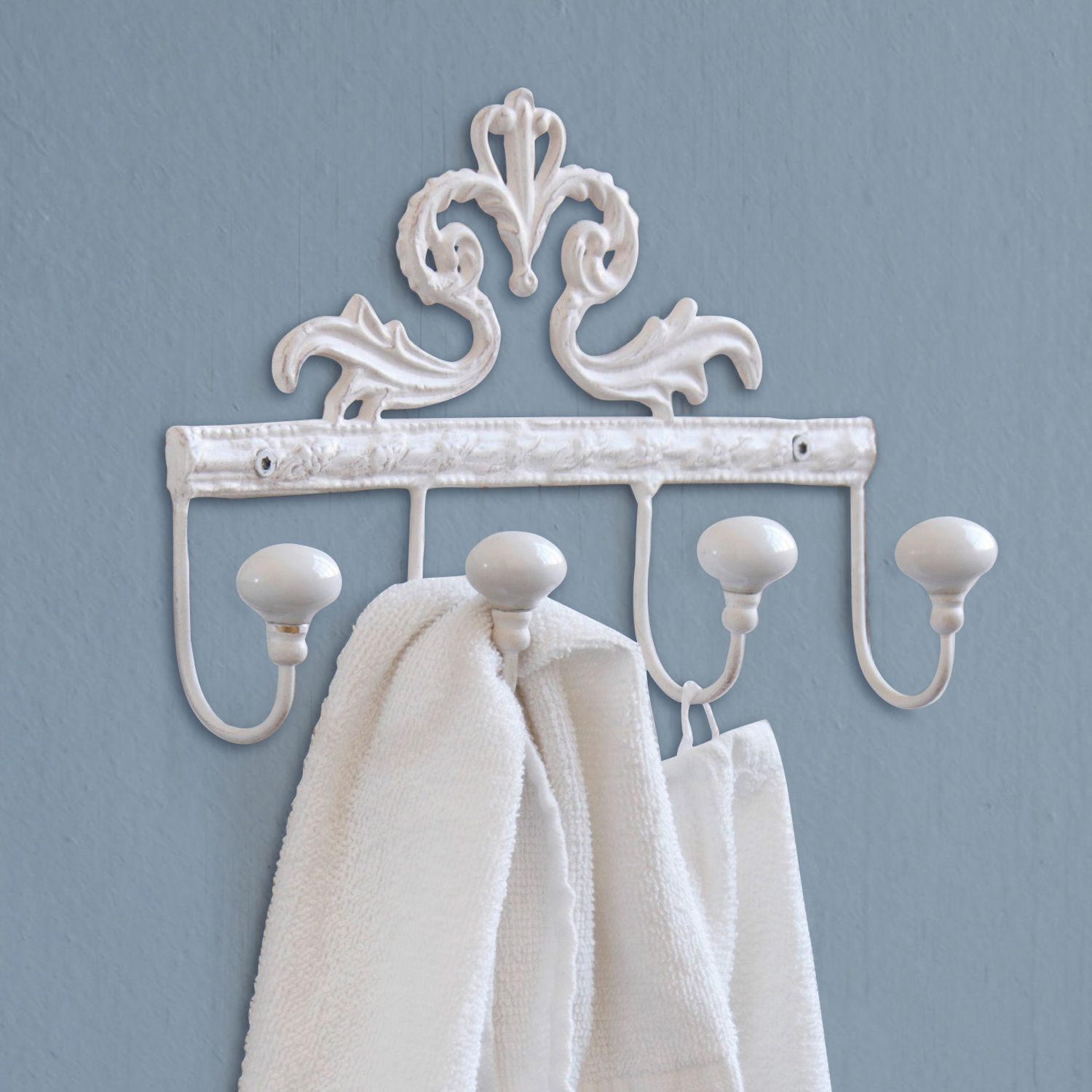 Mit dieser Hakenleiste bringen sie nostalgischen Charme in Ihr Zuhause. Gleichzeitig passt dieses schöne Wandaccessoire perfekt zu vielen gehobenen und rustikalen Stilrichtungen. Die noble und mit Ornamenten verzierte Leiste ist aus weißen Messing gearbeitet und mit vier Harken bestückt. Jeder einzelne von ihnen ist abschließend mit einem Keramik-Knauf versehen. Die Leiste eignet sich hervorragend dafür in der Diele, Küche und im Bad gute Dienste zu leisten. So können an den Haken Handtücher, Geschirrhandtücher oder weitere Utensilien wie Schlüssel oder Ketten fortan stilvoll ihren festen Platz finden.