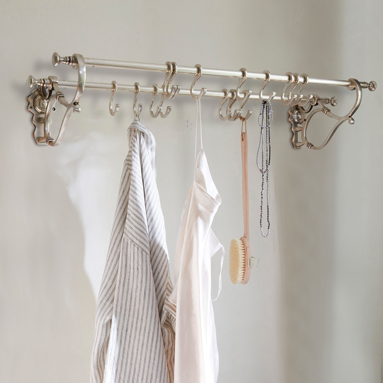Diese kunstvoll gefertigte, zweireihige Hakenleiste ist nicht nur besonders hübsch, sondern sie bietet auch viel Platz für Jacken, Mäntel und zahlreiche Accessoires. Mit sage und schreibe 16 Haken ist sie ideal für Familien und Haushalte, die regelmäßig Gäste empfangen. Die kompakten Abmessungen, das minimalistische Design und das robuste Material machen die Hakenleiste zu einer perfekten Wahl. Ihr charmantes Antiksilber-Finish passt mit den unterschiedlichsten Einrichtungsstilen zusammen und die Aufhängung ist für eine einfache Wandmontage konzipiert.