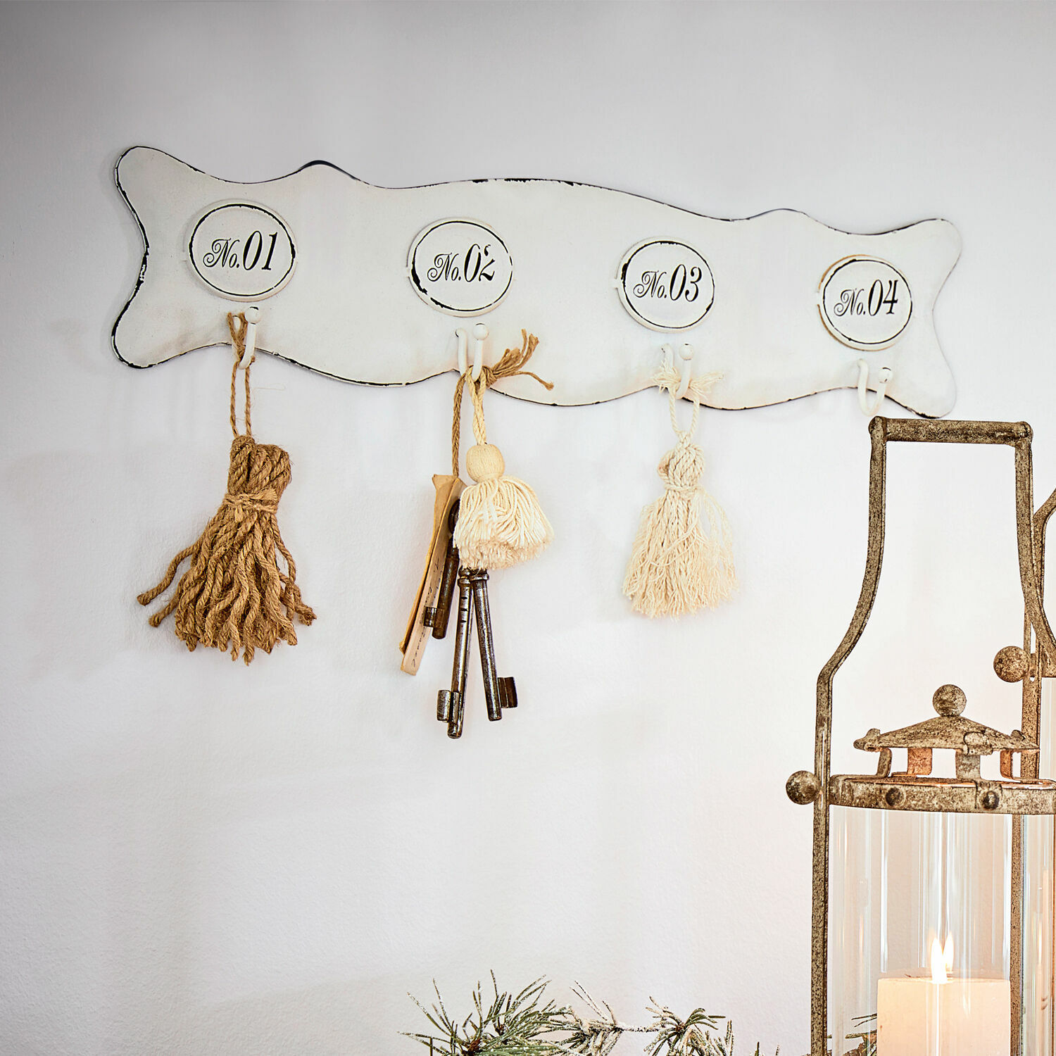 Egal, ob Sie im Badezimmer Handtücher oder in der Küche Geschirrtücher aufhängen möchten – unsere Hakenleiste erledigt den Job mit Bravour und bringt gleichzeitig antiken Charme in ihr Zuhause. Das kunstvoll verzierte Stück ist aus reinem Eisen gefertigt und antikweiß lackiert. Über jedem der vier Haken ist ein nummeriertes Schild angebracht und auf der Rückseite finden sich natürlich Vorrichtungen zum einfachen Anbringen.