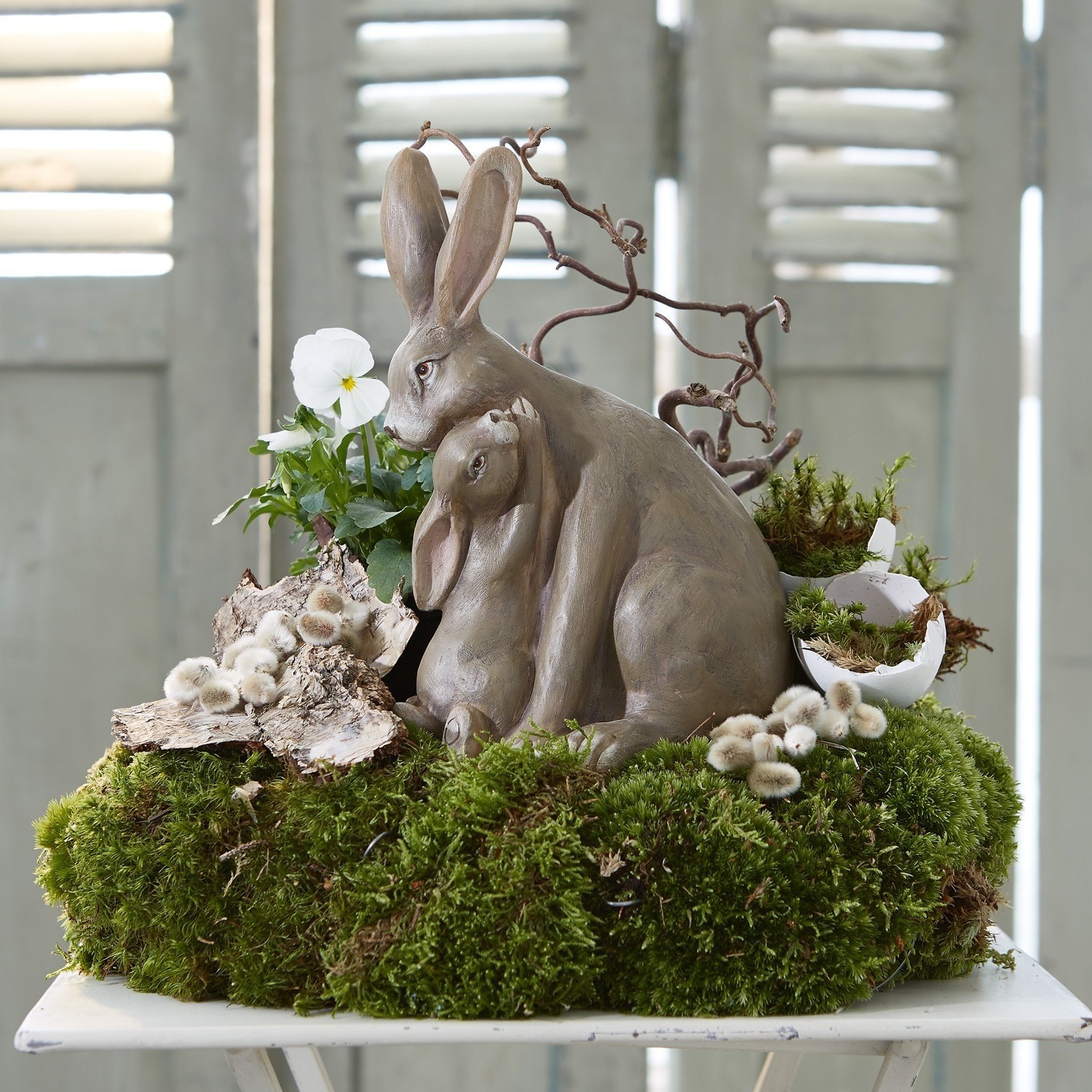 Wie niedlich! Diese beiden Osterhäschen lassen wirklich Herzen schmelzen. Sie scheinen sich innig zu umarmen und zaubern uns direkt ein Lächeln ins Gesicht. Die Hasenfiguren sind aufwendig von Hand bemalt und detailreich gestaltet, von der Ohrenspitze bis zu den Pfötchen. Ein bezaubernder Akzent zum Osterfest und auch sonst ein hübsches Deko-Element für alle, die die Natur lieben. Die freundlich wirkende Tierskulptur besteht aus Polyresin.