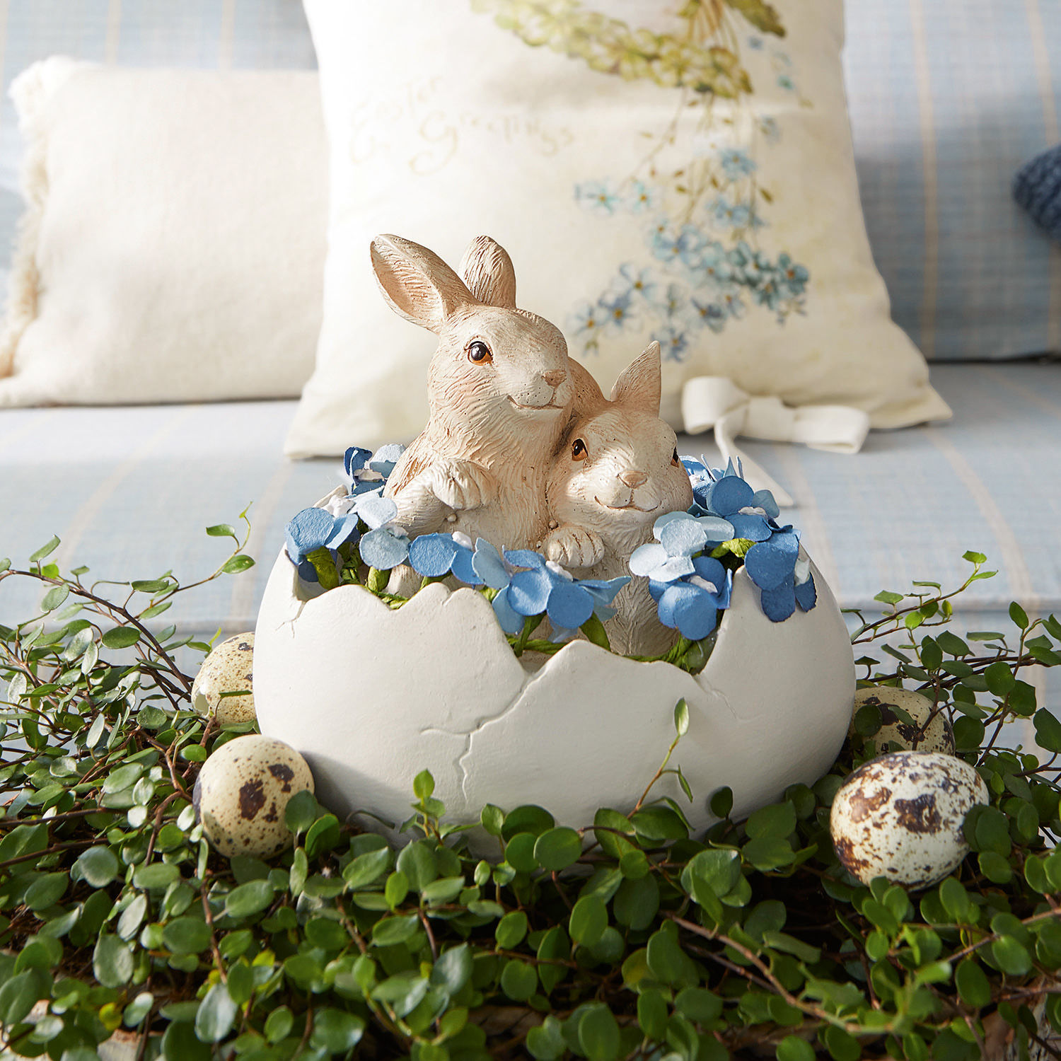 Sie wünschen sich strahlende Gesichter zu Ostern? Dann ist dieses entzückende Oster-Design die perfekte Wahl. Es besteht aus Polyresin und ist liebevoll von Hand bemalt. Als Motiv wurden zwei hinreißende Häschen gewählt, die es sich in einer mit Blüten gefüllten Eierschale gemütlich gemacht haben. Von dort aus schauen sie uns neugierig an, und ihre lieben Gesichter bringen einfach jeden zum Lächeln. Das verspielt gehobene Pfötchen unterstreicht den süßen Eindruck noch. Platzieren Sie sie vielleicht am Ostertisch oder auf der Fensterbank und freuen Sie sich über den verspielten Akzent. Solo oder mit weiterem Osterschmuck und Zweigen kombiniert, entsteht ein charmantes Arrangement und es kommt gute Laune zum Fest auf.