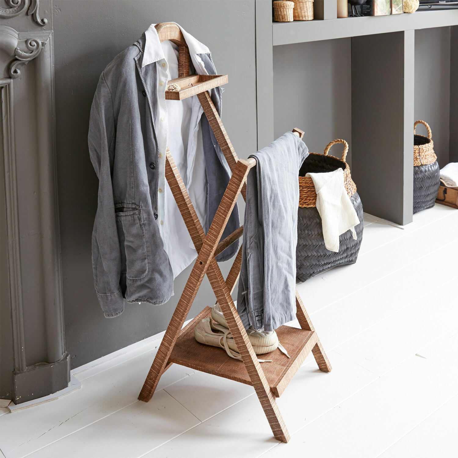 Dieser hochwertige Herrendiener ist der beste Freund für qualitätsbewusste Fashionistas. Egal ob Mann oder Frau, er macht Ihnen das Leben leichter, verleiht jedem Raum Stil und ist gleichzeitig ein Statement für klassische Eleganz. Hosen, Kleider, Blusen, Hemden lassen sich probemlos daran aufhängen. Das zeitlose Design schmeichelt nicht nur dem Auge, sondern es ist perfekt durchdacht, damit nicht nur Ihre Kleidung, sondern auch Accessoires platzsparend und sicher aufbewahrt werden können. Die wunderschöne Holzkonstruktion bietet sogar eine herausnehmbare Ablage, vielleicht für Manschettenknöpfe und Schmuck. Der Hosenbügel hat die richtige Höhe und bewahrt das Beinkleid vor unschönen Knitterfalten. Jacke oder Blazer lassen sich an den dafür vorgesehenen Bügel an der Rückseite des Ständers hängen und ebenso knitterfrei aufbewahren. Der Herrendiener ist hervorragend ausbalanciert und trotz seines schlanken Designs robust und widerstandsfähig. Das bezaubernde Mangoholz punktet zudem mit einer natürlich schönen Maserung, die im Laufe der Jahre immer attraktiver wird. Die Kleidungsstücke auf dem Foto sind natürlich nicht im Lieferumfang enthalten.