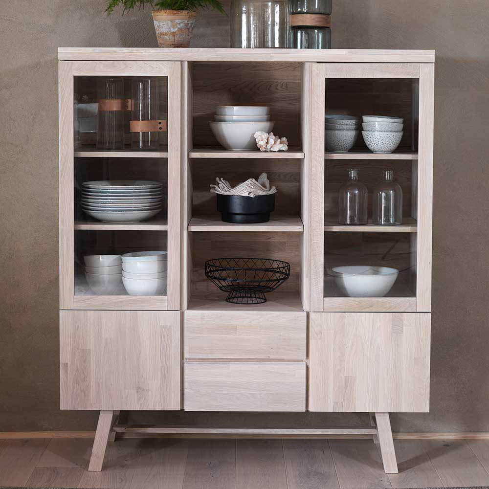 – Highboard Holz White Wash – Wohnzimmerschrank Eiche Massivholz – Kommode Modern – Esszimmerschrank Breite: 130 – Wohnzimmer schrank Höhe: 150 – Wohnzimmer kommode Tiefe: 45 – Highbord Mit zwei Schubladen, mit Soft Close und mit Metallauszug – Esszimmer kommode Schrank-Tür: mit Drehtüren – Wohnzimmer highboard 4-türig, Innenaufteilung: mit Einlegeböden – Wohnzimmerkommode Ohne Beleuchtung – Esszimmer highboard Zerlegt, zum leichten Selbstaufbau (Montageanleitung liegt bei) – Esszimmerkommode 4-Fuß Gestell aus Massivholz – Hängeschrank-holz Massivholz Oberfläche, Geölt, Gewachst (flüssigkeitabweisend), Gebürstet und White Wash – Eichenkommode Rechteckige Form – Massivholz Tür