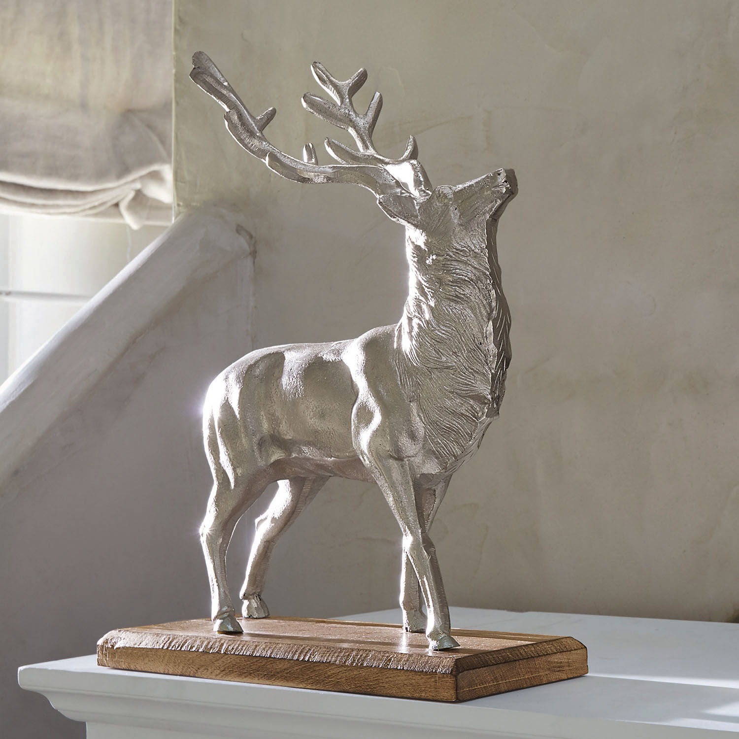 Der prachtvolle Hirsch besteht aus Aluminium handgegossen. Er steht auf einem Sockel aus wertvollem Mangoholz – ein schöner Material-Mix. Das authentische Design ist sehr detailreich gearbeitet, vom prachtvollen Geweih bis zu den Hufen. Holen Sie sich ein Design nach Hause, welches von tiefen Wäldern träumen lässt und das eine angenehme, winterliche Stimmung zaubert. Das elegante Modell schmeichelt jedem Wohnstil und hat ein leicht nostalgisches Flair. Auf einer Kaminkonsole, einer Anrichte oder dem Tisch setzen Sie damit einen geschmackvollen Akzent mit zeitlosem Stil.