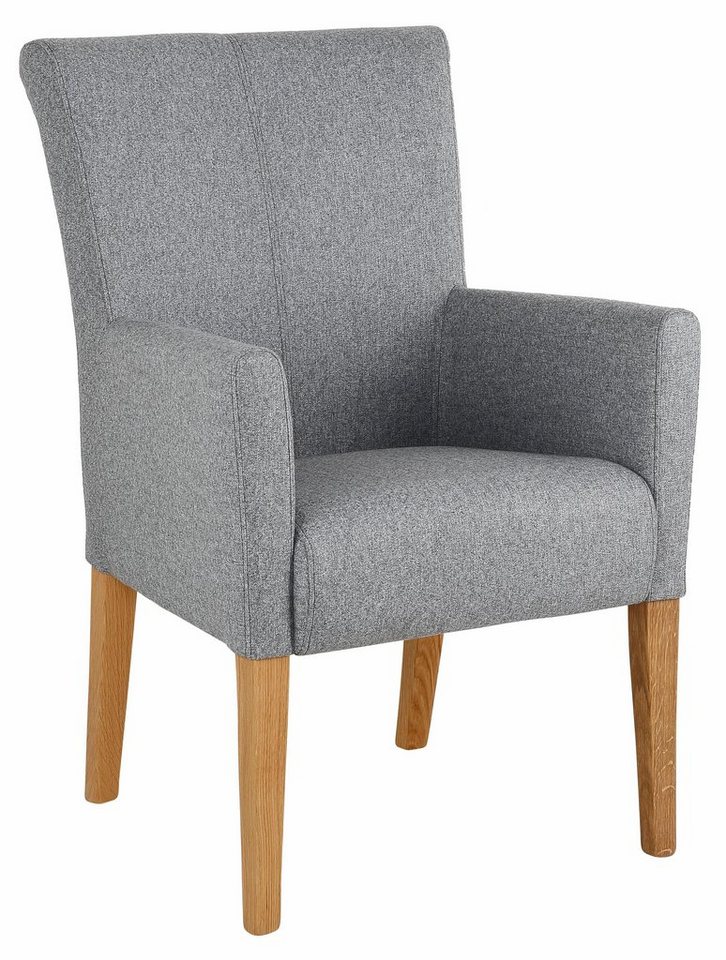 Im gemütlichen Landhausstil präsentiert sich der gepolsterte Armlehnstuhl »King« von Home affaire. Durch seine elegante Knopfheftung im Rücken fügt er sich als Blickfang in deinen Wohn-/Essbereich ein. Der Esszimmerstuhl besticht durch sein modernes Design, bei welchem die klare Formensprache überwiegt. Seine hohe Rückenlehne neigt sich bequem nach hinten. Hierzu passen die halbhohen Seitenteile, die in komfortable Armlehnen münden. Strapazierfähige Bezüge in attraktiver Strukturoptik definieren das Erscheinungsbild. Hierzu ist ein Vierfußgestell aus Massivholz kombiniert, das einen effektvollen Kontrast herstellt. In puncto Sitzkomfort kann der Sessel im Weiteren überzeugen: Alle Komponenten besitzen ein angenehmes Polster und sind ergonomisch angeordnet für ein ermüdungsfreies Sitzen. Der Stuhl überzeugt durch seine hochwertige Verarbeitung. Eignet sich als Beistellmöbel in deinem Schlafzimmer: der gepolsterte Armlehnstuhl »King« von Home affaire.