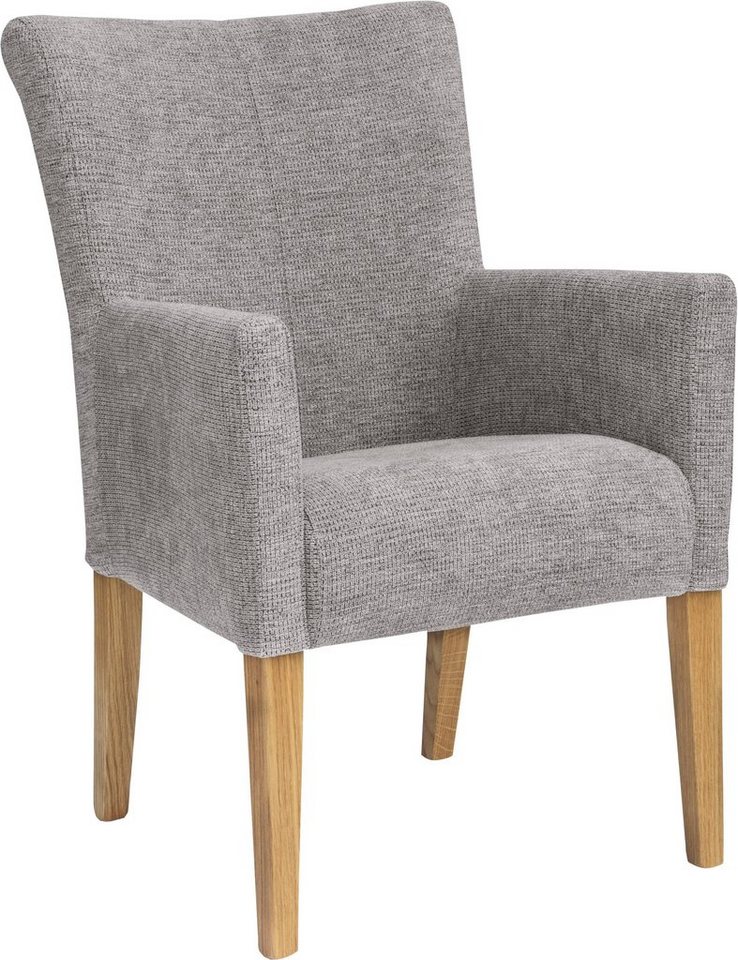 Im gemütlichen Landhausstil präsentiert sich der gepolsterte Armlehnstuhl »King« von Home affaire. Durch seine elegante Knopfheftung im Rücken fügt er sich als Blickfang in deinen Wohn-/Essbereich ein. Der Esszimmerstuhl besticht durch sein modernes Design, bei welchem die klare Formensprache überwiegt. Seine hohe Rückenlehne neigt sich bequem nach hinten. Hierzu passen die halbhohen Seitenteile, die in komfortable Armlehnen münden. Strapazierfähige Bezüge in attraktiver Strukturoptik definieren das Erscheinungsbild. Hierzu ist ein Vierfußgestell aus Massivholz kombiniert, das einen effektvollen Kontrast herstellt. In puncto Sitzkomfort kann der Sessel im Weiteren überzeugen: Alle Komponenten besitzen ein angenehmes Polster und sind ergonomisch angeordnet für ein ermüdungsfreies Sitzen. Der Stuhl überzeugt durch seine hochwertige Verarbeitung. Eignet sich als Beistellmöbel in deinem Schlafzimmer: der gepolsterte Armlehnstuhl »King« von Home affaire.