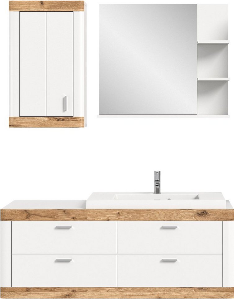 Produktdetails Set beinhaltet , In folgenden Farben erhältlich: Korpus/Front: weiß / weiß matt TZ, Farbe Griffe: silber, Details zur Ausstattung: Metallgriffe, Set bestehend aus: Hängeschrank, Waschtisch, Spiegel mit Ablage, Hängeschrank: 1 Tür, Türanschlag wechselbar, 2 Fächer, Fachmaße (B/T/H): ca. 29/16/31 cm, 1 fester Boden, Maße (B/T/H): 45/20/76 cm, Waschtisch: 4 Schubladen, Schubkasteninnenmaße (B/T/H): ca. 55/33/11 cm, Schubkasteninnenmaße (B/T/H): ca. 9/33/11 cm, Keramikbecken – widerstandsfähig gegen Kratzer, Maße (B/T/H): 133/48/49 cm, Spiegel: 3 Ablagen, Maße (B/T/H): 80/20/70 cm, , |Funktionen , Badezimmer, |Art Griffe , Griffleiste, | Farbe & Material Material Griffe , Metall, |Optik , matt, | Maßangaben Breite , 132 cm, |Tiefe , 48 cm, |Höhe , 172 cm, | Lieferung & Montage Lieferzustand , zerlegt, |Aufbauhinweise , einfache Selbstmontage mit Aufbauanleitung inklusive Aufbauanleitung – eine zweite Person zum Aufbau wird empfohlen, | Hinweise Herstellergarantie , 2 Jahre gemäß den Garantie-Bedingungen, |Hinweis Maßangaben , Alle Angaben sind ca.-Maße., |Markeninformationen , Seit 2001 begeistert uns Home affaire mit Landhausmöbeln zum Verlieben. Ob modern, romantisch oder natürlich traditionell – der Fantasie für wunderschönes Einrichten sind kaum Grenzen gesetzt., |