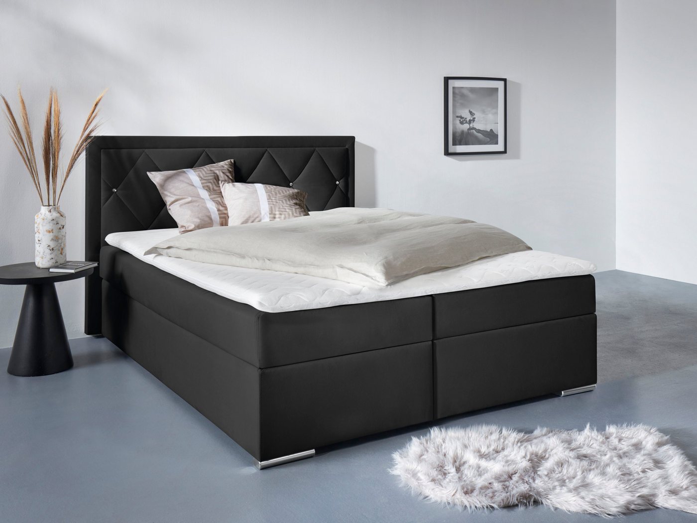 Mit Bettkasten ausgestattetes Bett Bei diesem Boxbett »Alfie, Bestseller, wahlweise mit Bettkasten« von Leonique hast du dank der praktischen Bettkästen Stauraum für Decken, Laken und Kissen. Die hochwertige 7-Zonen-Taschen-Federkernmatratze mit einer Höhe von 16 cm stützt mithilfe ihrer Federn und der verschiedenen Liegezonen einzelne Körperpartien ab und sorgt so für einen angenehmen Liegekomfort und erholsamen Schlaf. Geeignet ist sie mit dem Härtegrad H3 für ein Körpergewicht bis zu 100 kg. Auf der Matratze befindet sich ein Kaltschaum-Topper mit einer Höhe von 5 cm. Er dient als kuschelige Auflage und schützt gleichzeitig die darunterliegende Matratze. Das Kopfteil ist 106 cm hoch. Das Material für die Montage ist inklusive, sodass der Gang zum Baumarkt dafür nicht notwendig ist. Elemente aus Metall Aus Metall gefertigt sind die Füße besonders widerstandsfähig und langlebig. Der Bezug besteht aus Samt — einem angenehm weichen Material, das außerdem edel glänzt. Klassisches Design richtig kombiniert Du fragst dich, wie sich das Möbelstück kombinieren lässt? Hier eine kleine Inspiration für dich: Die Ästhetik des modernen Stils ist reduziert und strahlt eine schlichte Eleganz aus. Daher passen vor allem Elemente aus Naturstein oder Glas gut dazu. So könntest du dich einrichten: In Kombination mit schimmernden Akzenten würde der zeitlose elegante Look noch besser zur Geltung kommen. Das Produkt ist Teil der Alfie Serie. Weitere Artikel aus der Serie lassen sich gut dazu kombinieren. Das Herzstück deiner Schlafoase — das Boxbett »Alfie, Bestseller, wahlweise mit Bettkasten« von Leonique.