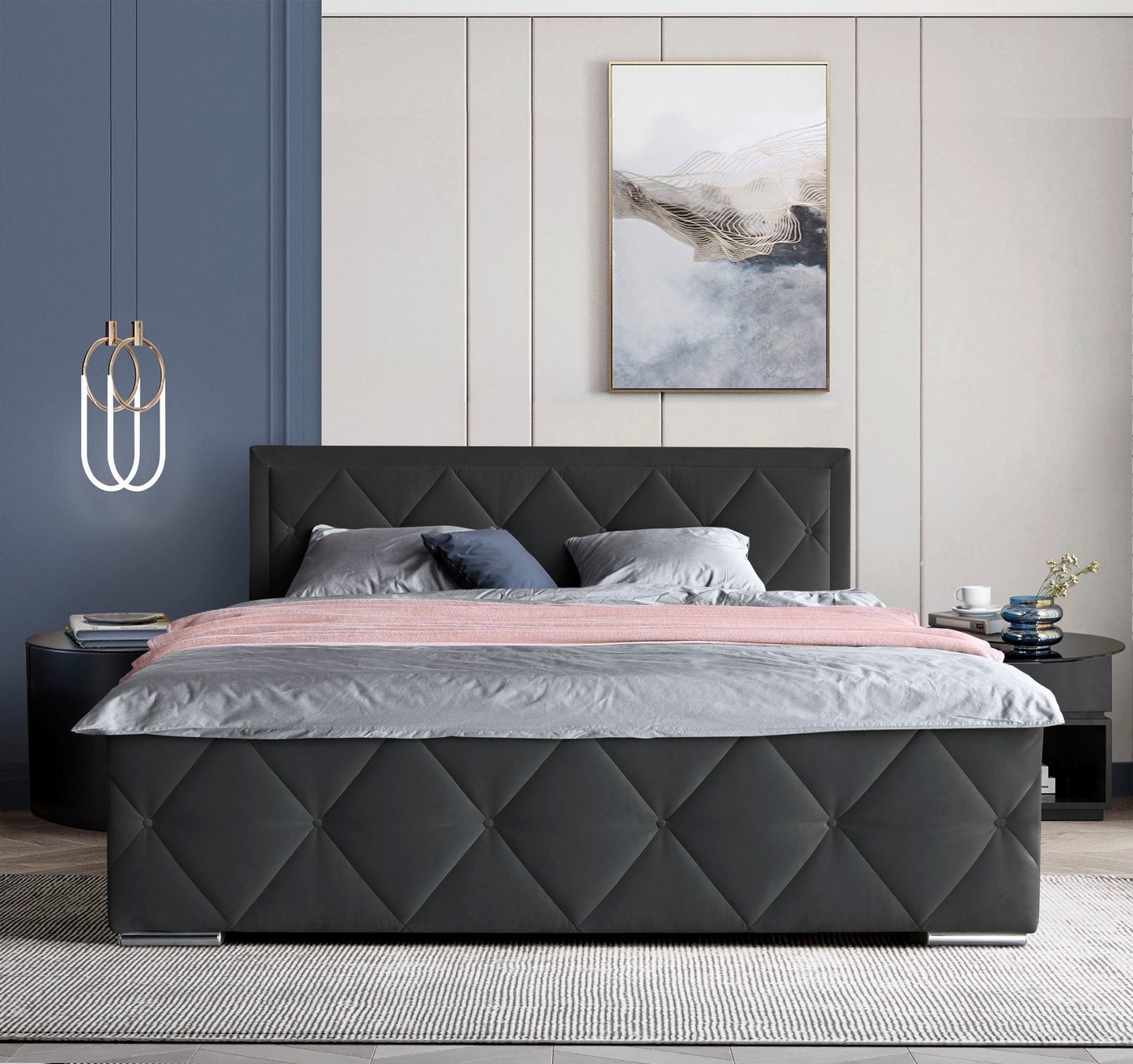 Mit Bettkästen ausgestattetes Bett Bei diesem Boxbett »Alfie, Topseller! Inkl. Bettkasten&,Topper« von Leonique hast du dank der praktischen Bettkästen Stauraum für Decken, Laken und Kissen. Die Bonnell-Federkernmatratze mit einer Höhe von 16 cm fühlt sich durch ihre flächenelastische Eigenschaft weich und behaglich an. Sie sorgt aufgrund der hohen Luftzirkulation für ein angenehmes Schlafklima und optimalen Temperaturausgleich. Mit dem Härtegrad H2 ist sie für ein Körpergewicht bis zu 80 kg geeignet. Auf der Matratze liegt ein 5 cm hoher PUR-Schaum-Topper. Er erhöht den Schlafkomfort und dient zugleich als Matratzenschutz. Das Kopfteil ist 106 cm hoch. Bezug mit Samtvelours-Eigenschaften Der Holzwerkstoff, aus dem das Bettgestell besteht, überzeugt mit seiner Stabilität und Tragfähigkeit, wobei die Oberfläche schön ebenmäßig und widerstandsfähig ist. Dank des Samtstoffes sieht der Bezug besonders elegant aus und ist zudem scheuerbeständig. Inspirationen für einen eleganten Wohnstil Das Boxbett zeigt sich im klassischen Stil und zaubert ein stilvolles Ambiente. Zur Inspiration: Schicke Teppiche, polierte Möbeloberflächen und gläserne sowie verspiegelte Details passen perfekt zum exklusiven Wohnstil. Das Produkt ist Bestandteil der Alfie Serie. Auch hiervon kannst du dich beim Einrichten inspirieren lassen. Gut einschlafen, fit aufwachen — mit dem Boxbett »Alfie, Topseller! Inkl. Bettkasten&,Topper« von Leonique.